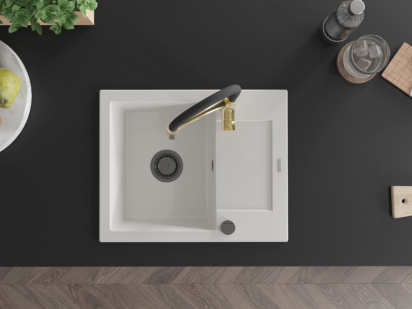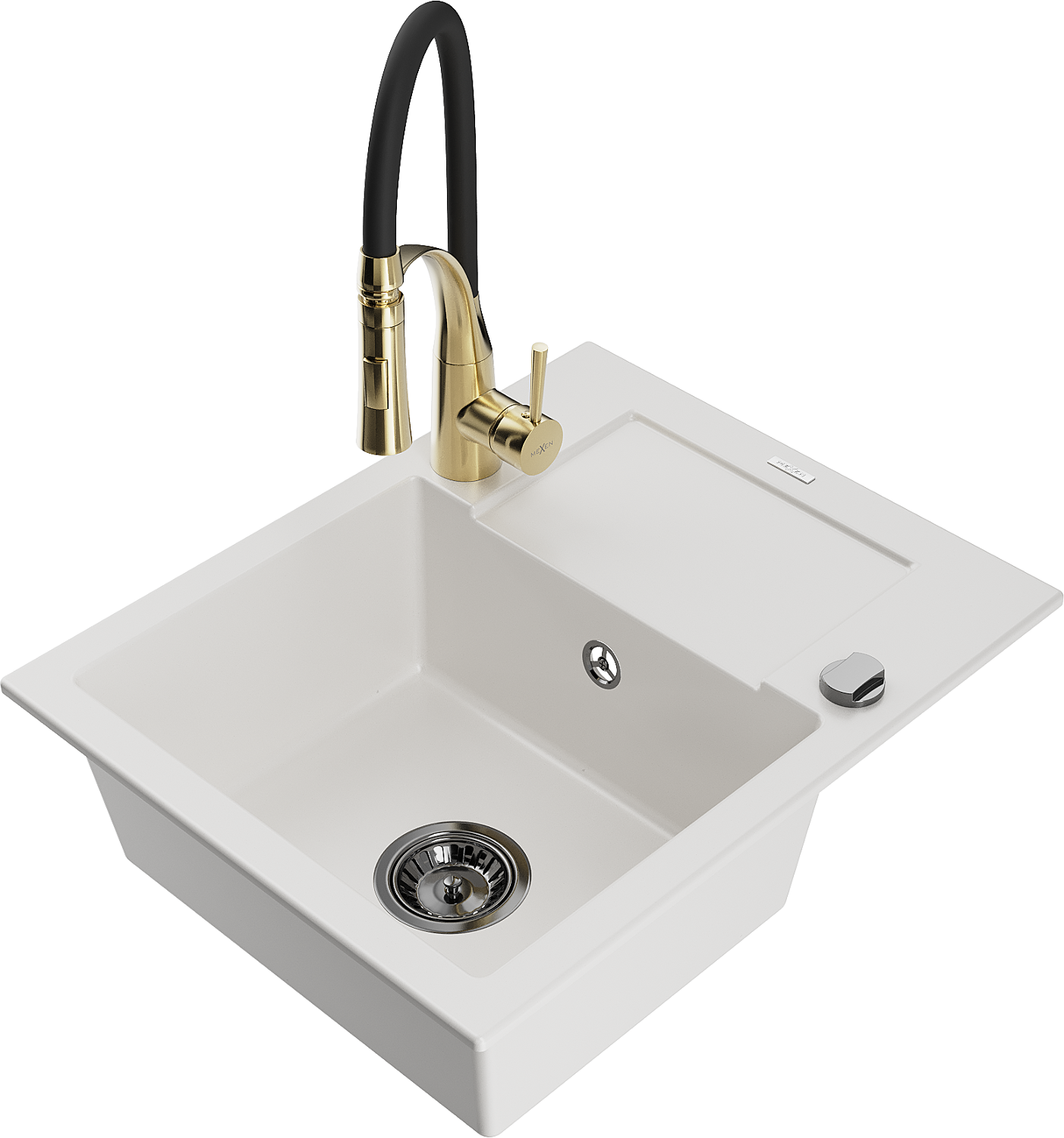 Mexen Enzo gránit mosogató 1-medencés, csepegtetővel és Aster konyhai csapteleppel, fehér - 6506-20-73450-57-B