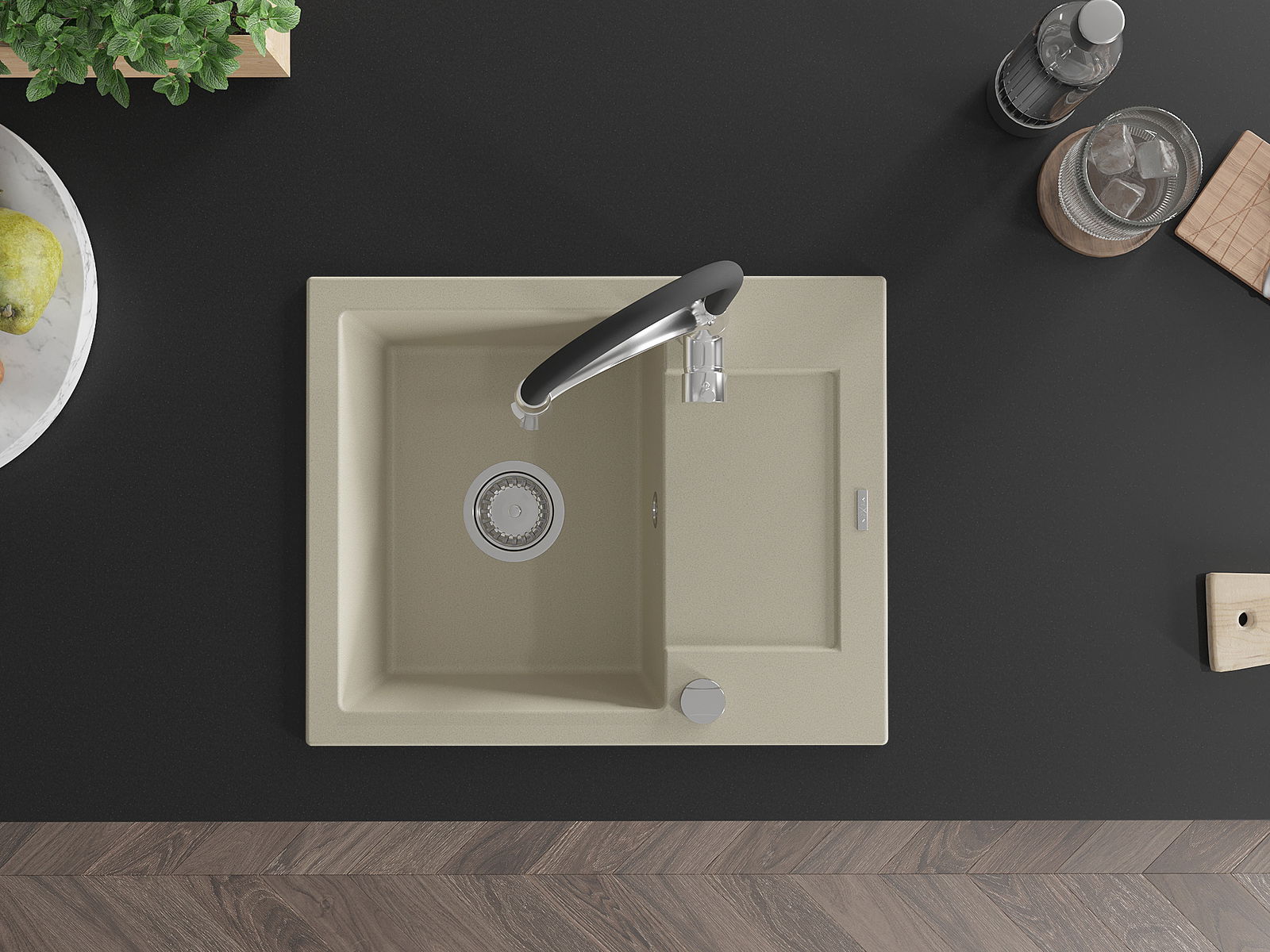 Mexen Enzo egymedencés gránit mosogató csepegtetővel és Aster konyhai csapteleppel, bézs - 6506-69-73450-07
