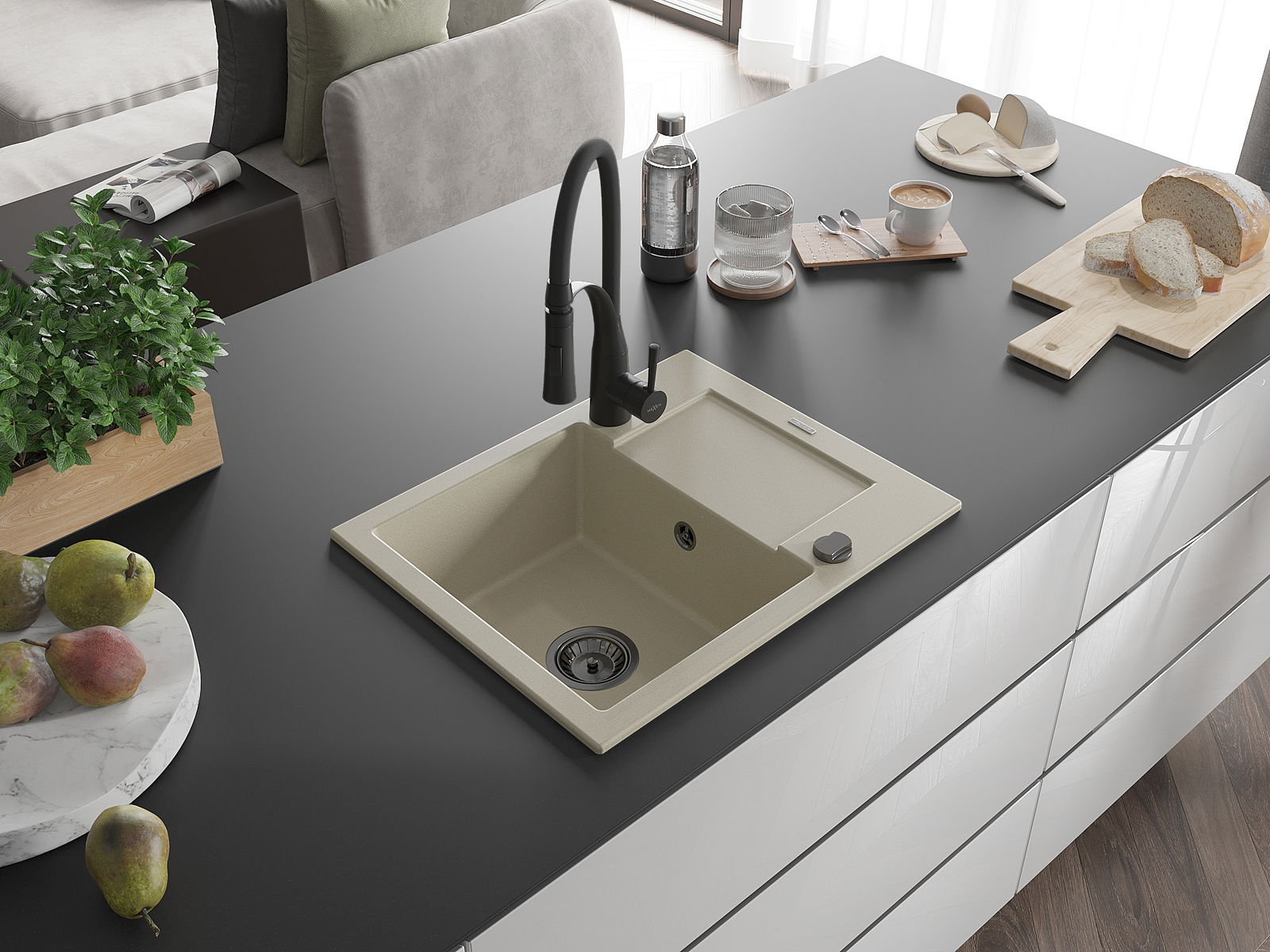 A mosogató kiváló minőségű gránitból készül. Ez egy elegáns és mindenekelőtt minden konyhához praktikus kiegészítés, stílusától függetlenül. A kiváló minőségű és a gránit tartósság biztosítja a sok éves használatát.
