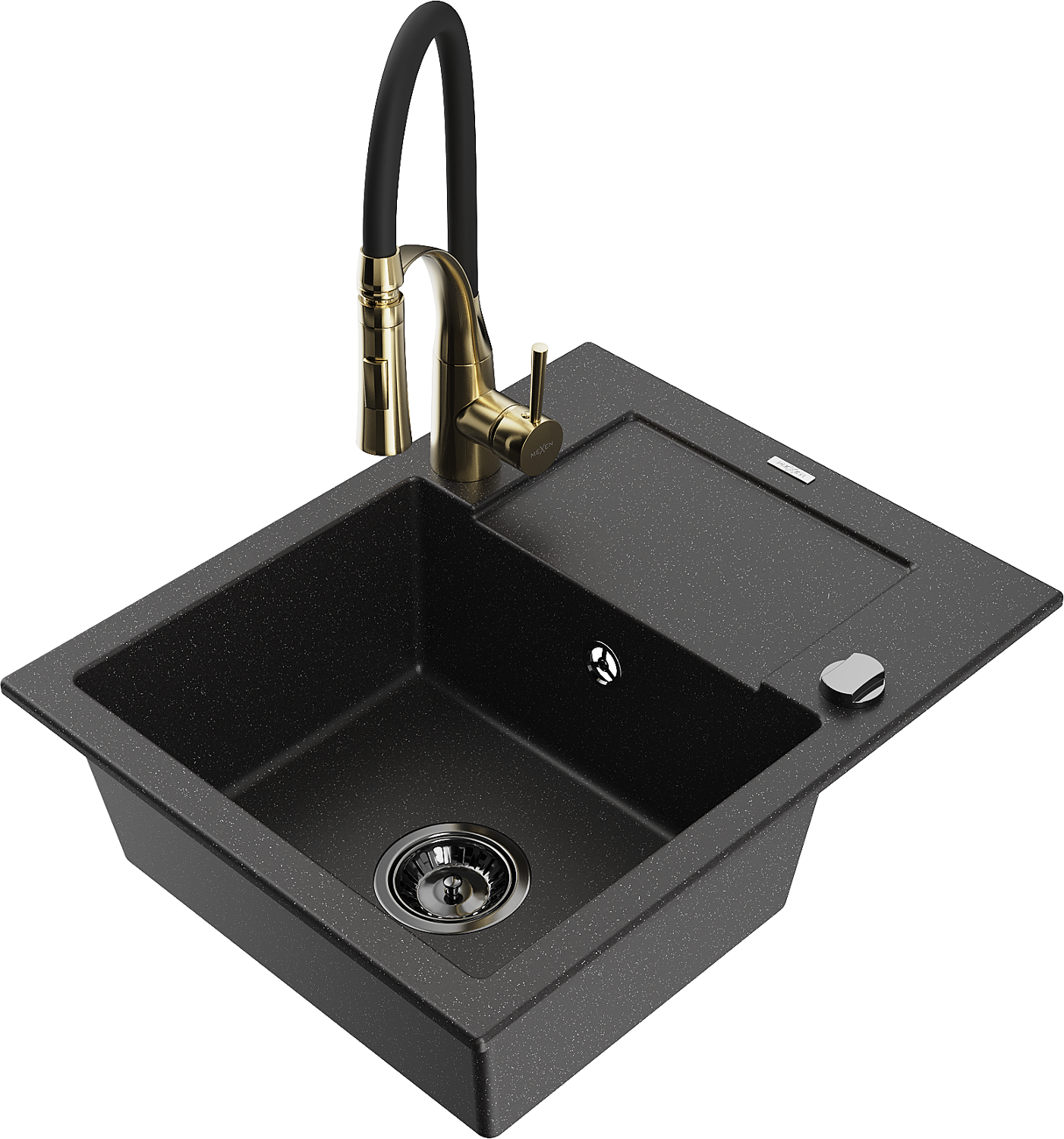 Mexen Enzo 1-medencés gránit Mosogató, csepegtetővel és Aster konyhai csapteleppel, fekete/ezüst metál - 6506-73-73450-57-B