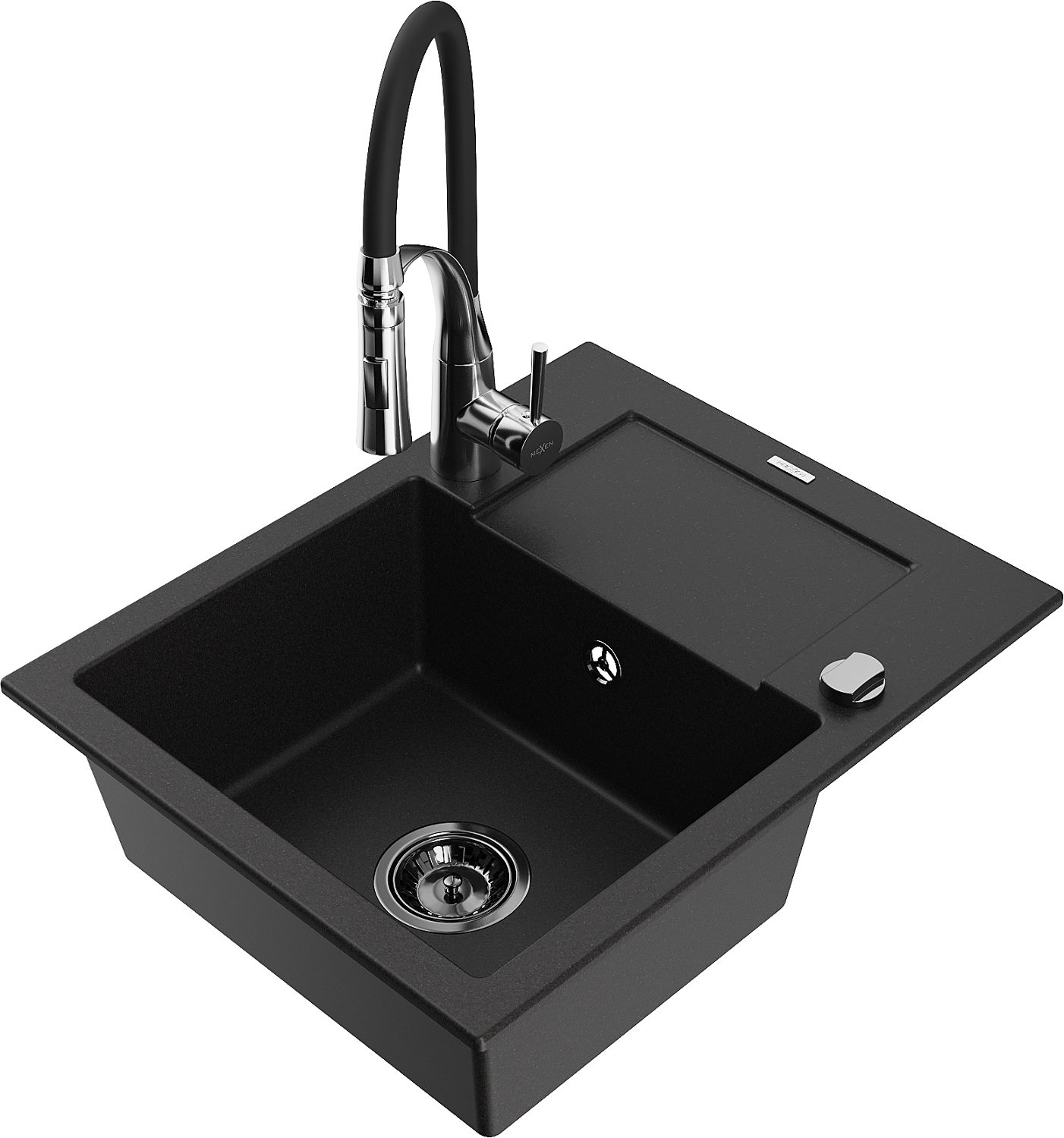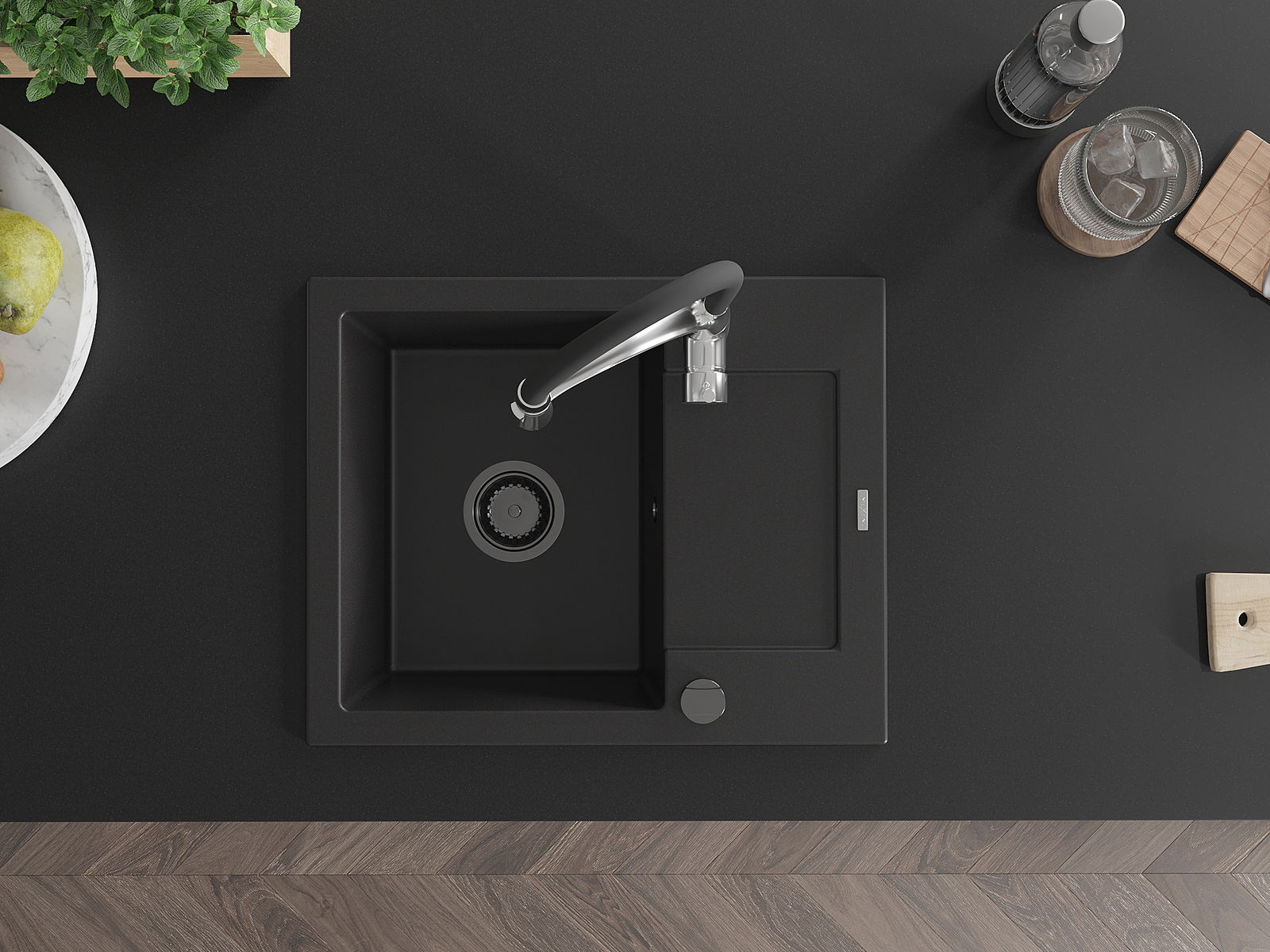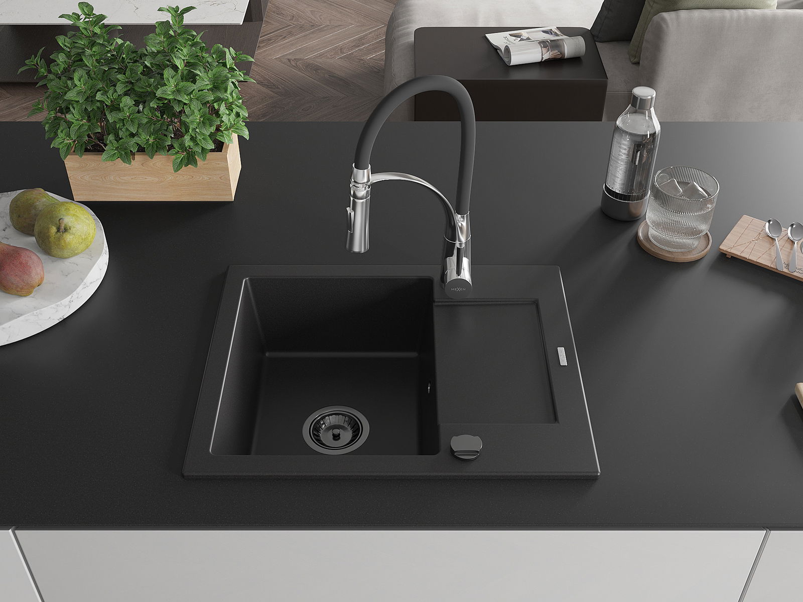 Mexen Enzo 1-medencés gránit mosogató csepegtetővel és Aster konyhai csappal, fekete - 6506-77-73450-07-B