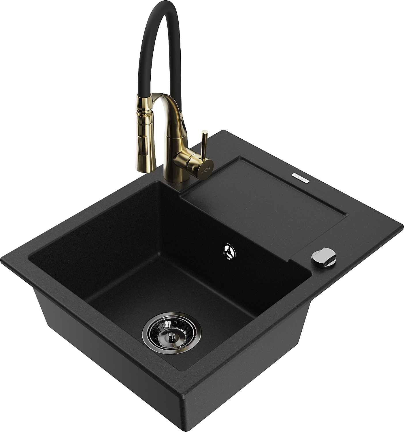 Mexen Enzo, 1 rekeszes gránit mosogató csepegtetővel és Aster konyhai csapteleppel, fekete - 6506-77-73450-57-B