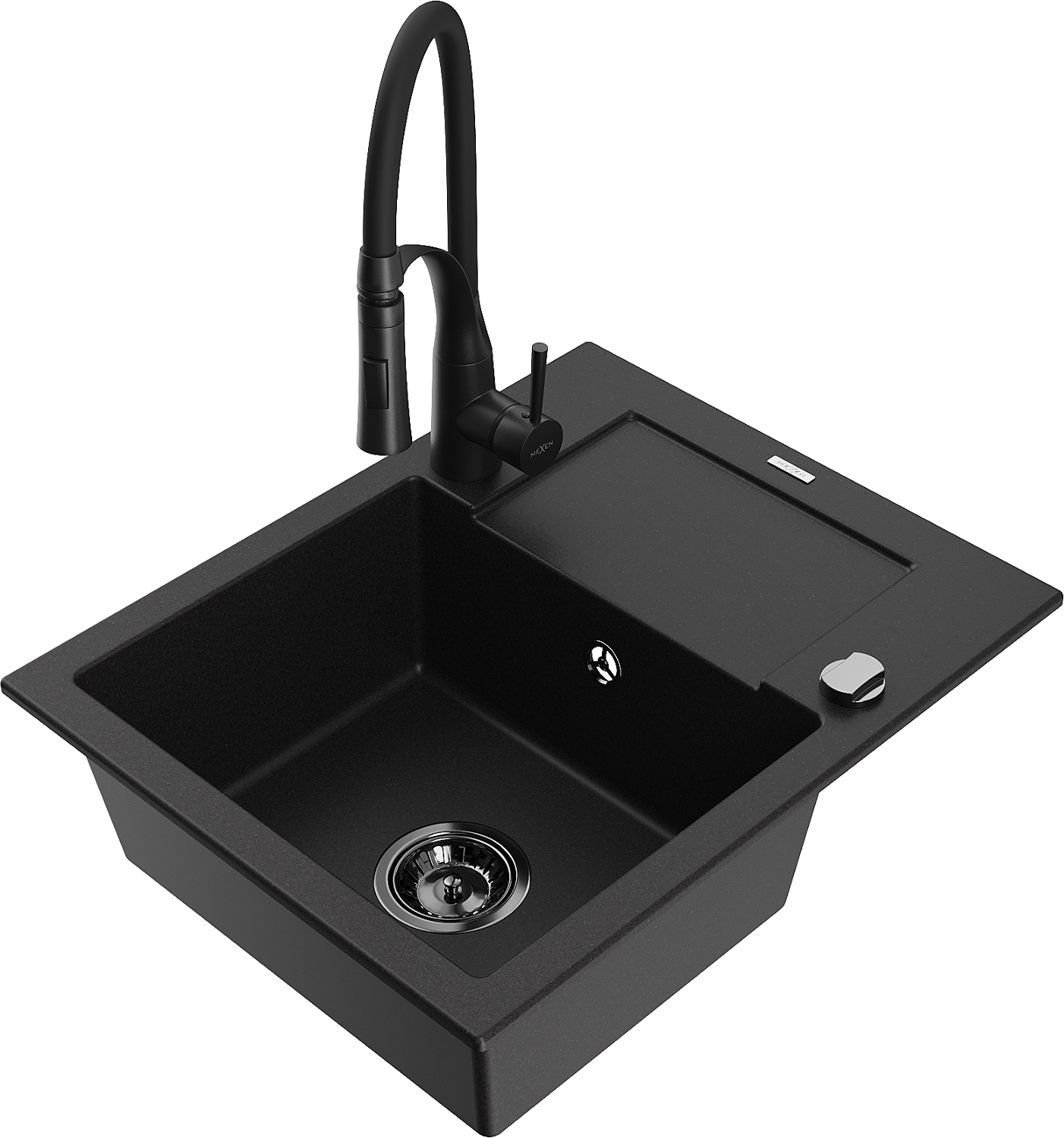 Mexen Enzo gránit mosogató 1-medencés csepegtetővel és Aster konyhai csappal, fekete - 6506-77-73450-70-B