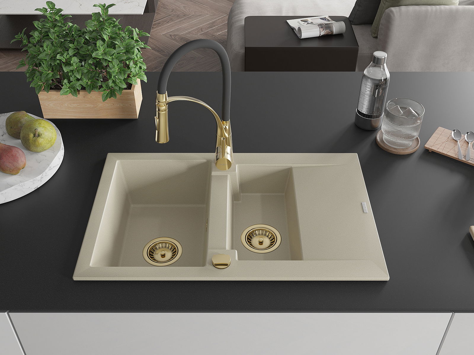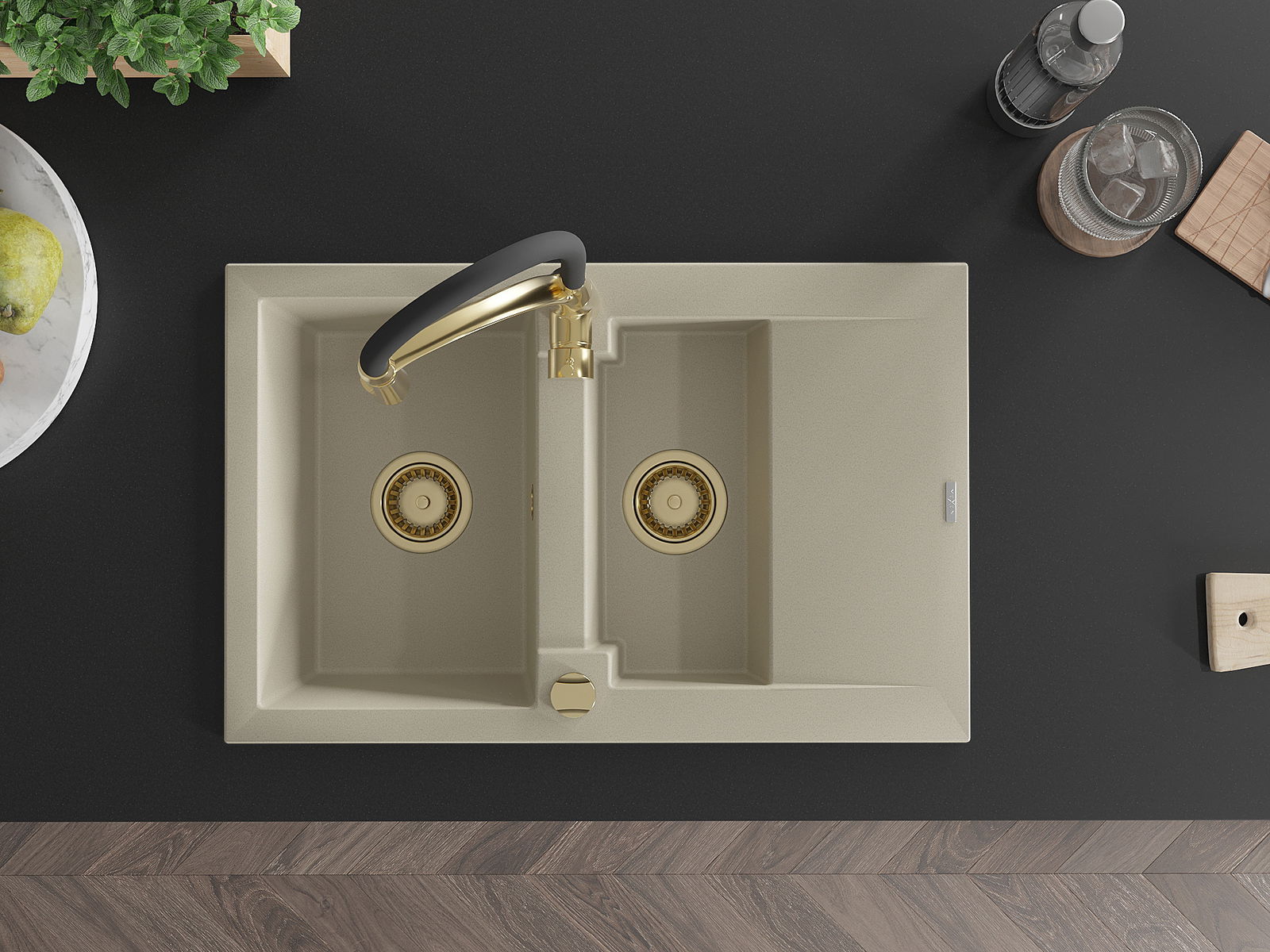 Mexen Gaspar gránit mosogatótálca 1,5 rekeszes csepegtetővel és Aster konyhai csappal, bézs - 6507-69-73450-57-G