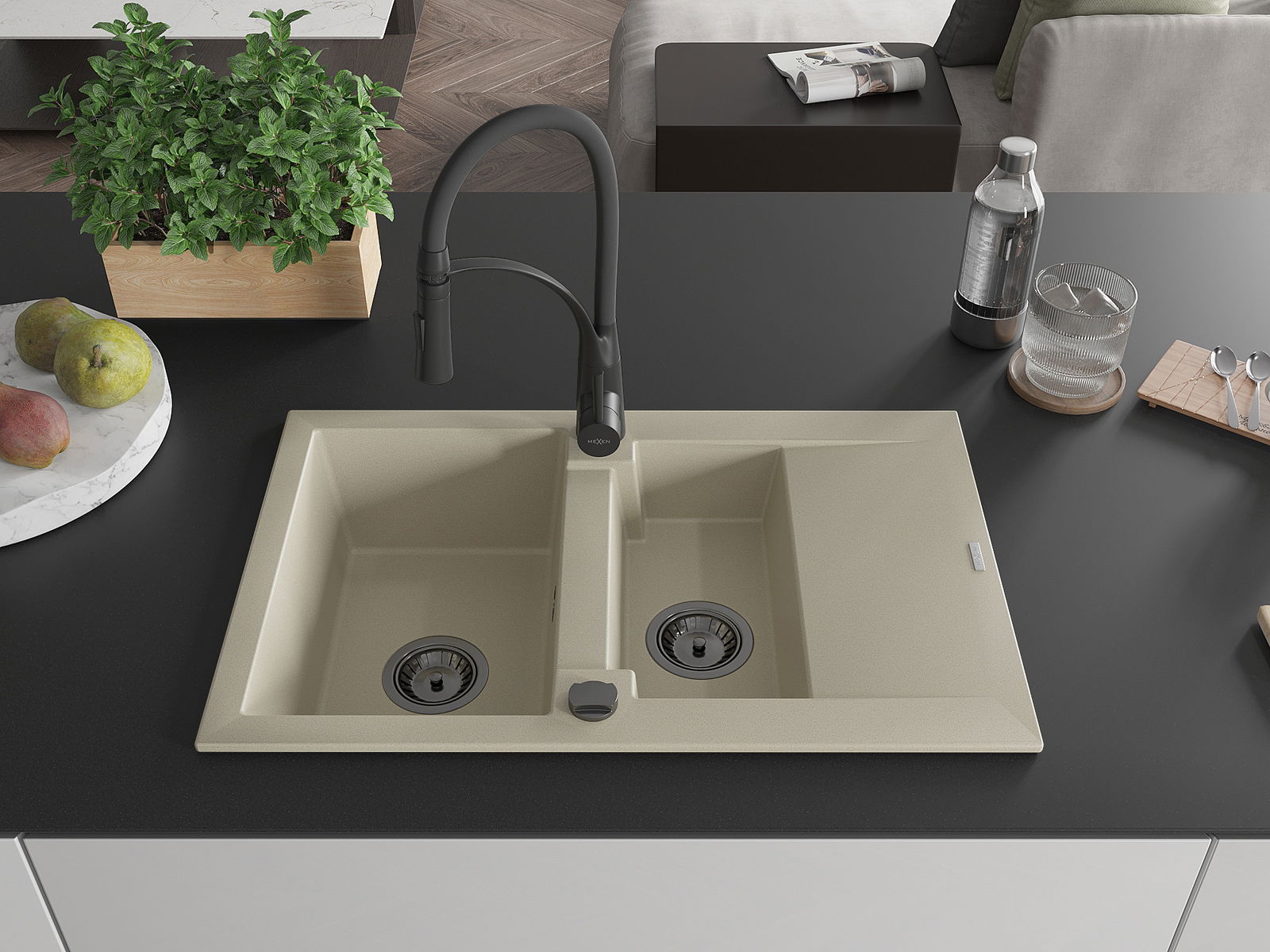A mosogató kiváló minőségű gránitból készül. Ez egy elegáns és mindenekelőtt minden konyhához praktikus kiegészítés, stílusától függetlenül. A kiváló minőségű és a gránit tartósság biztosítja a sok éves használatát.