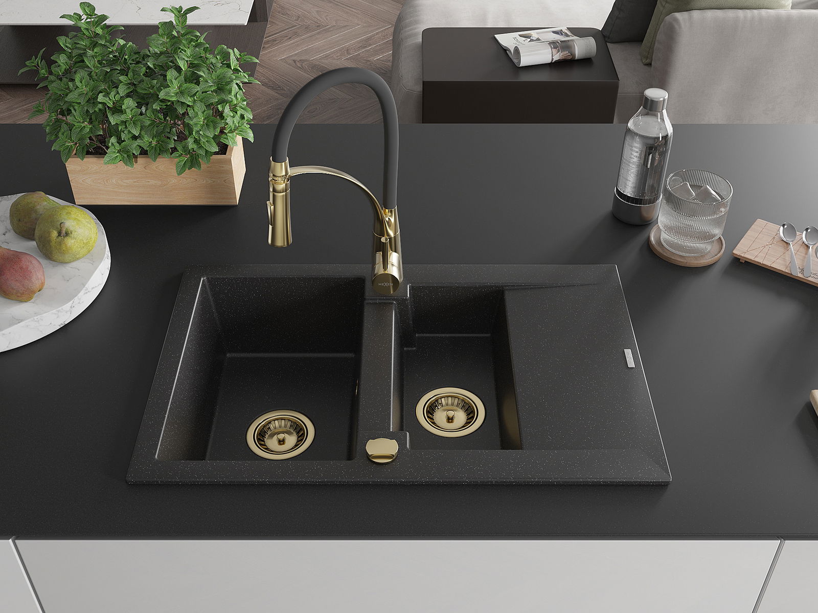Mexen Gaspar gránit 1,5-medencés mosogató csepegtetővel és Aster konyhai csapteleppel, fekete/ezüst - 6507-73-73450-57-G