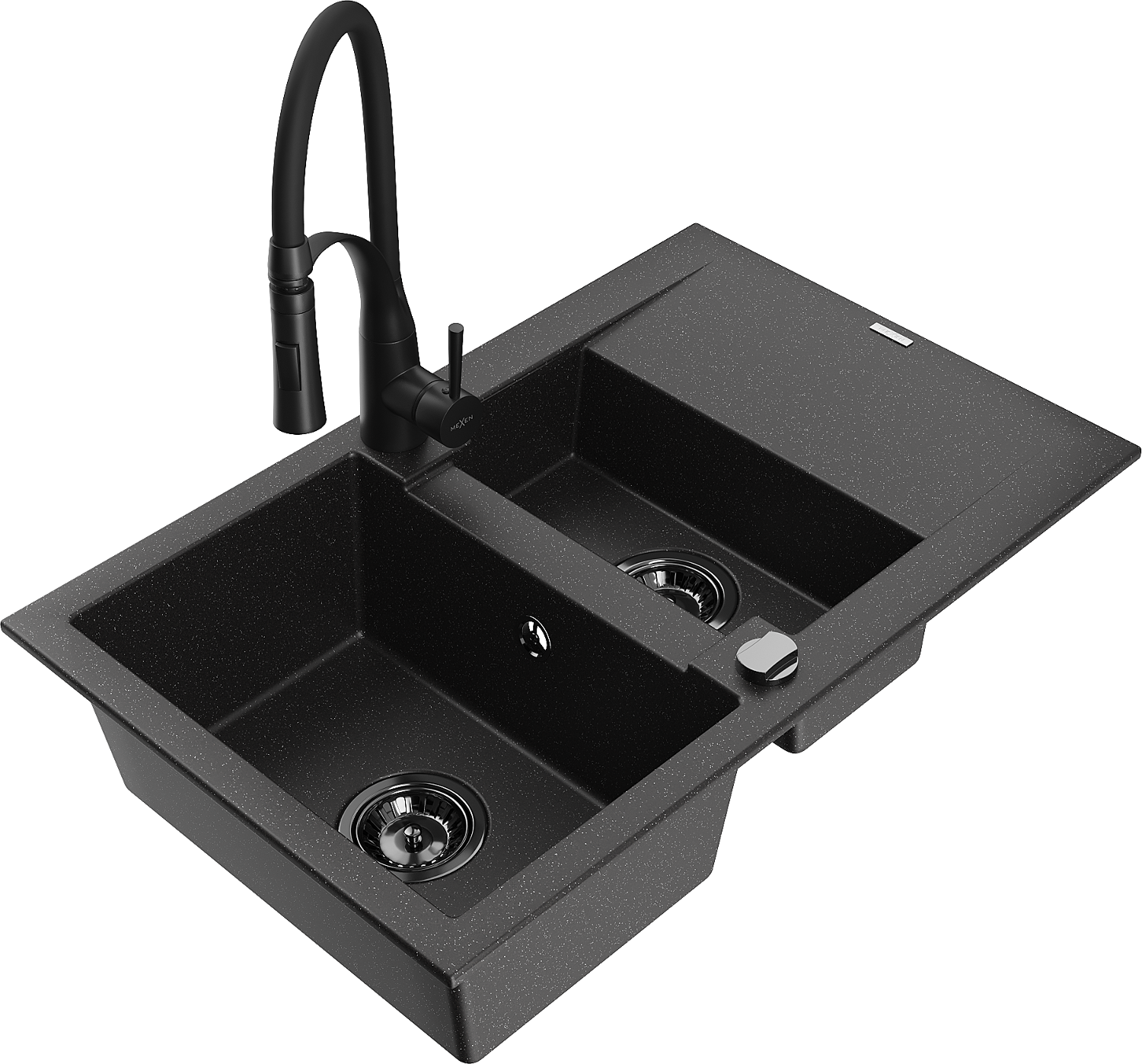 Mexen Gaspar gránit mosogató 1,5-medencés csepegtetővel és Aster konyhai csapteleppel, fekete/ezüst - 6507-73-73450-70-B