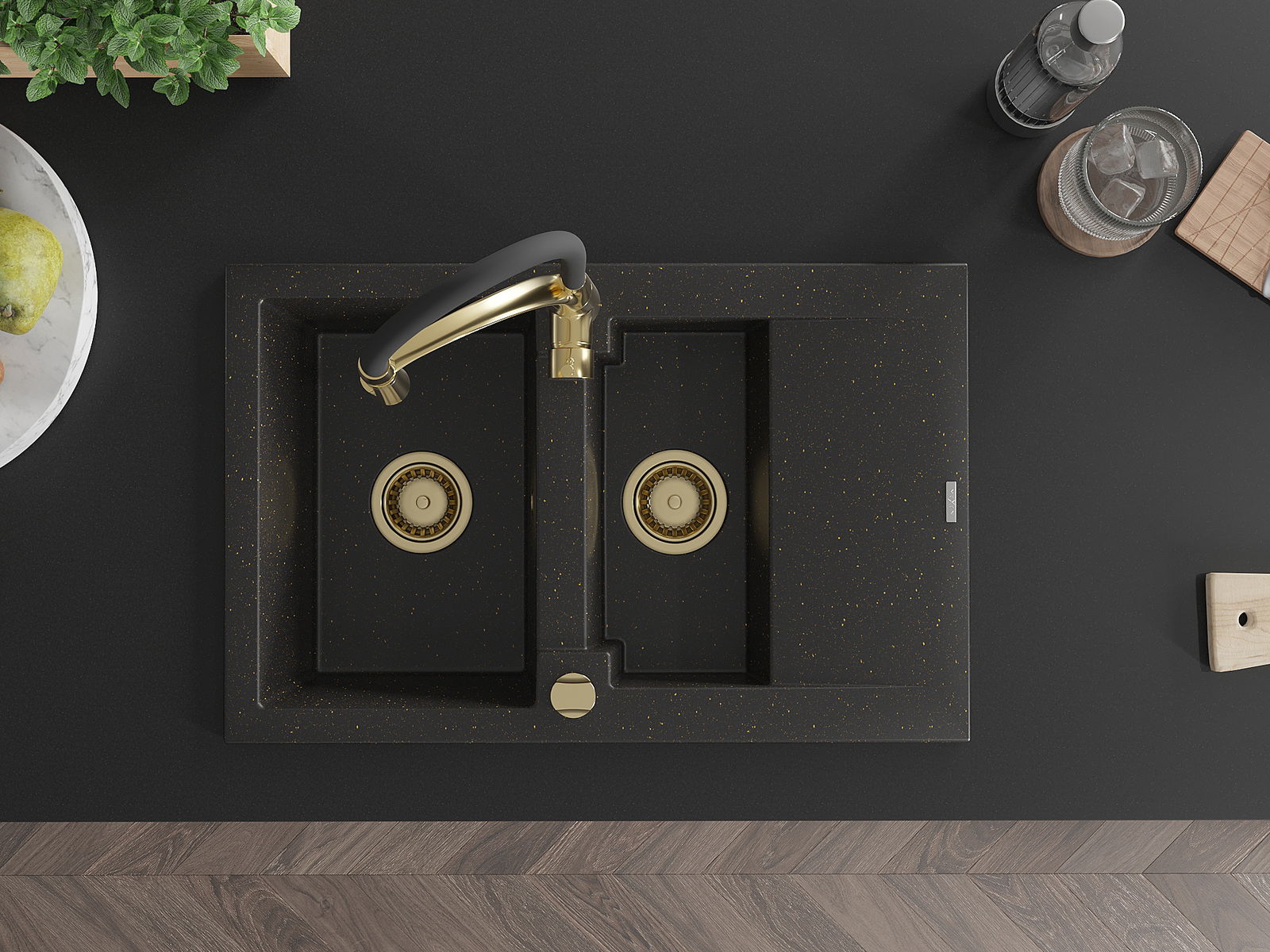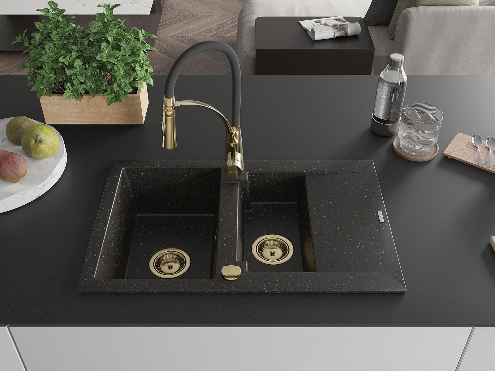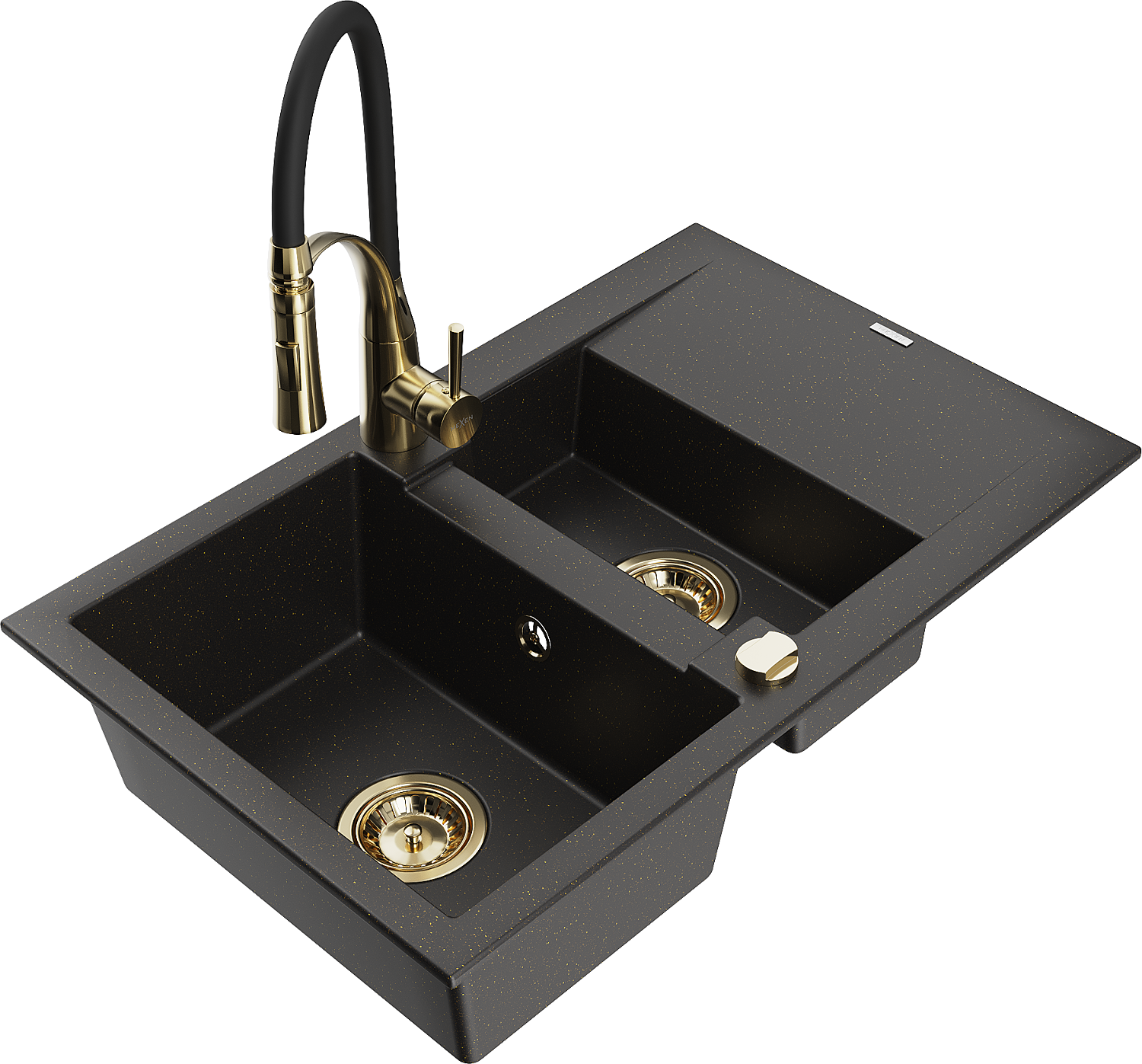 Mexen Gaspar gránit mosogató 1,5 medencés csepegtetőtálcával és Aster konyhai csappal, fekete/arany metál - 6507-75-73450-57-G