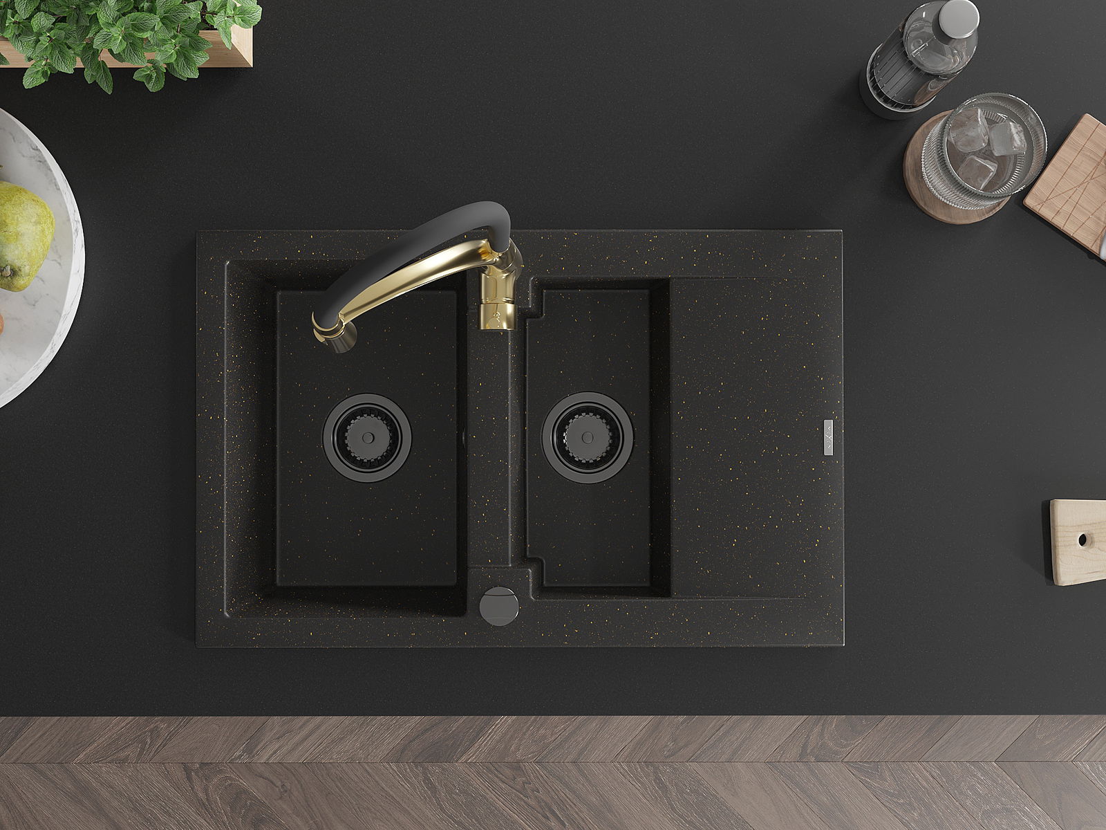 Mexen Gaspar gránit mosogató 1,5 medencés csepegtetővel és Aster konyhai csapteleppel, fekete/arany metál - 6507-75-73450-57-B