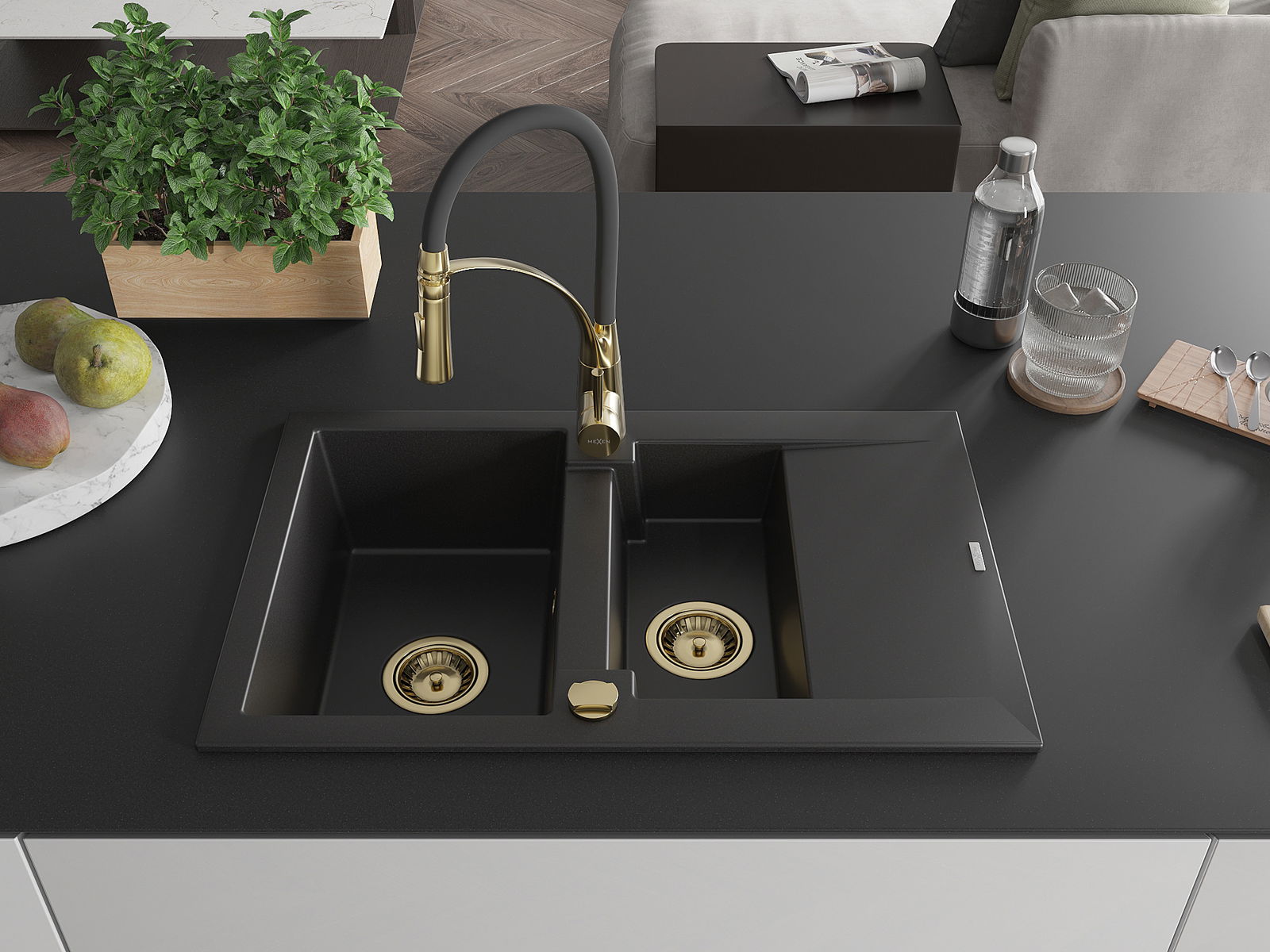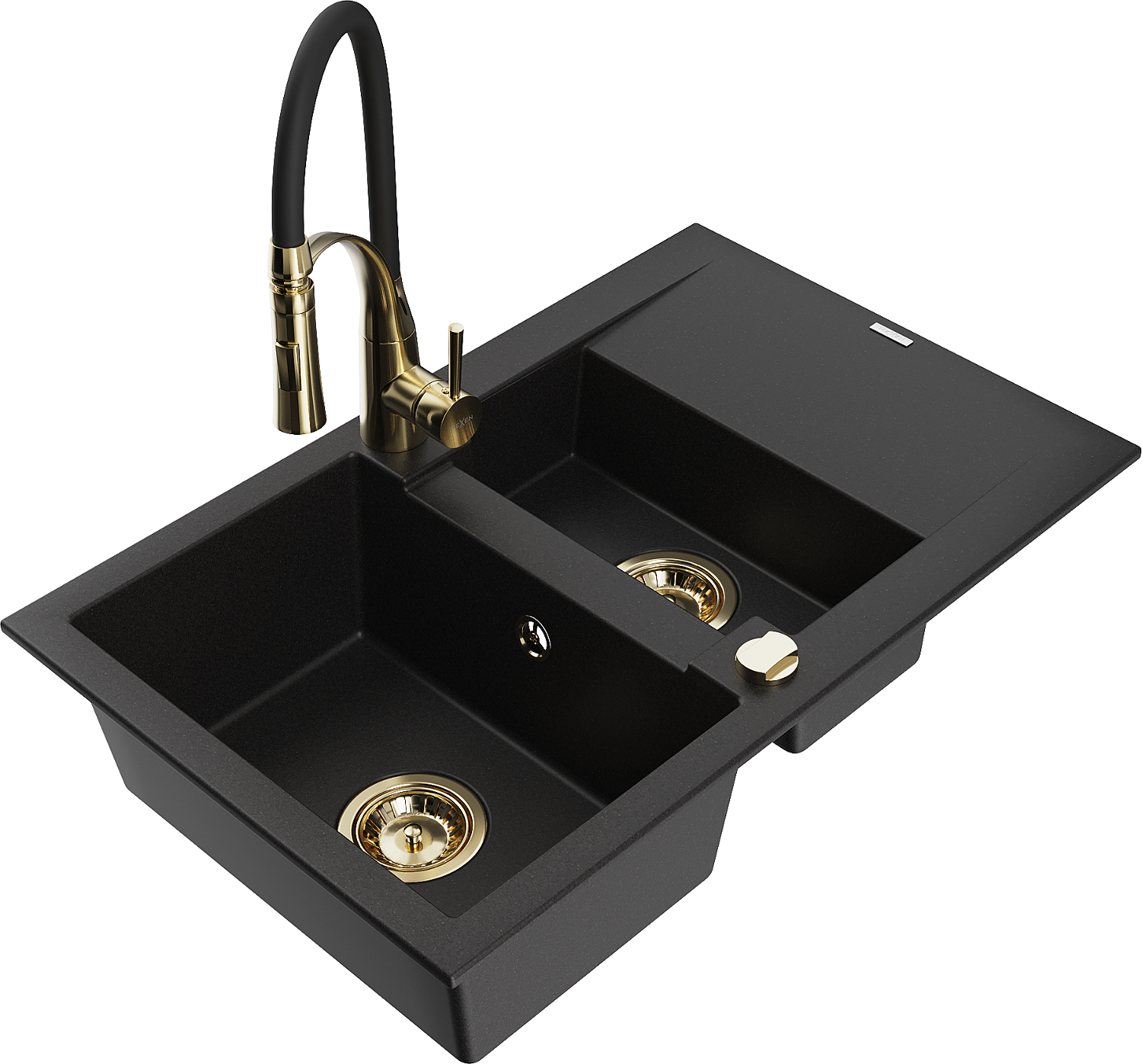 Mexen Gaspar 1,5-medencés gránit mosogatótálca csepegtetővel és Aster konyhai csapteleppel, fekete - 6507-77-73450-57-G