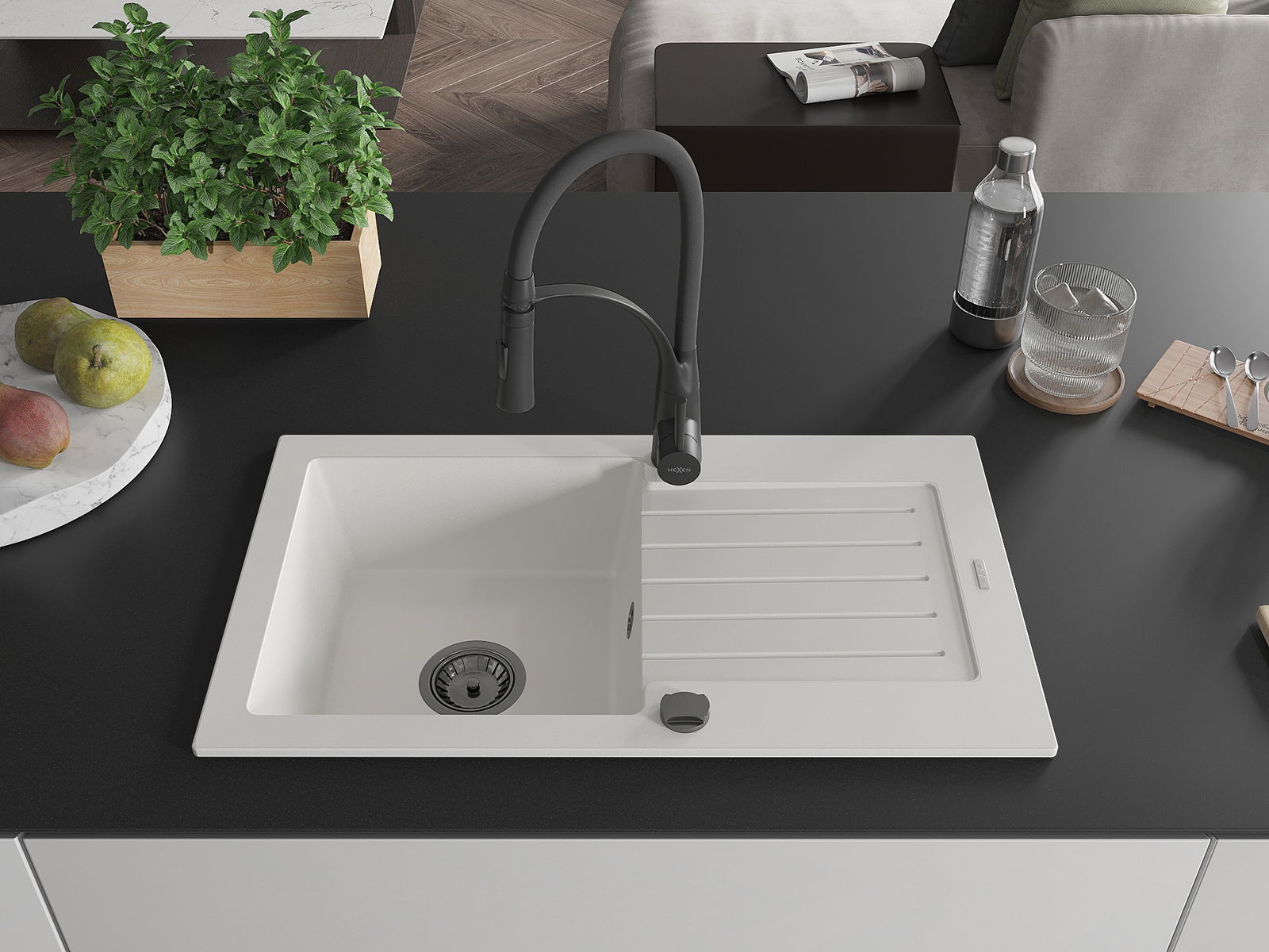 Mexen Pablo egymedencés gránit mosogató csepegtetővel és Aster konyhai csappal, fehér - 6510-20-73450-70-B