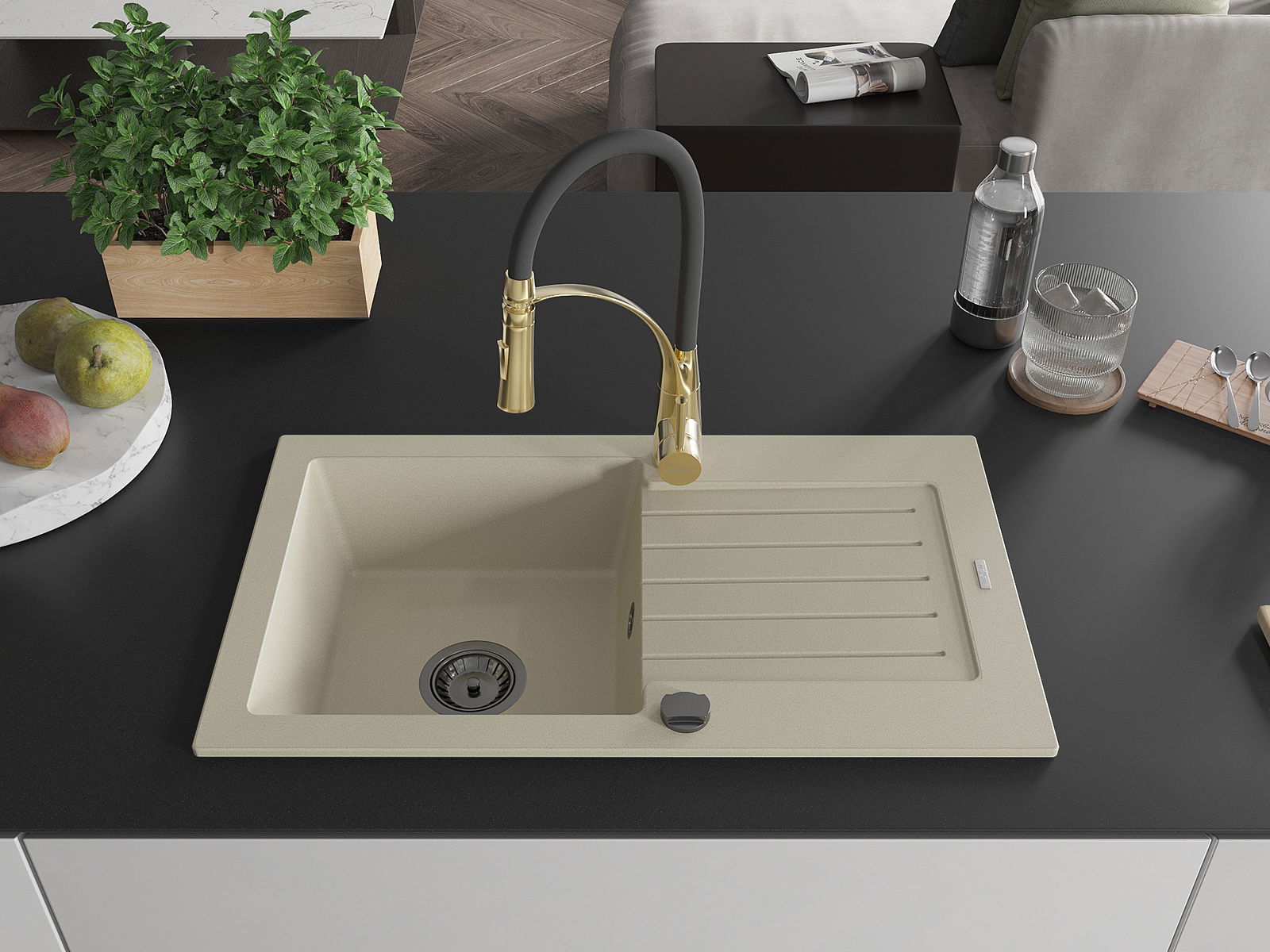 A mosogató magas minőségű gránitból készült. Elegáns, de mindenekelőtt praktikus kiegészítője minden konyhának, függetlenül annak stílusától. A gránit magas minősége és tartóssága hosszú távú használatot biztosít.