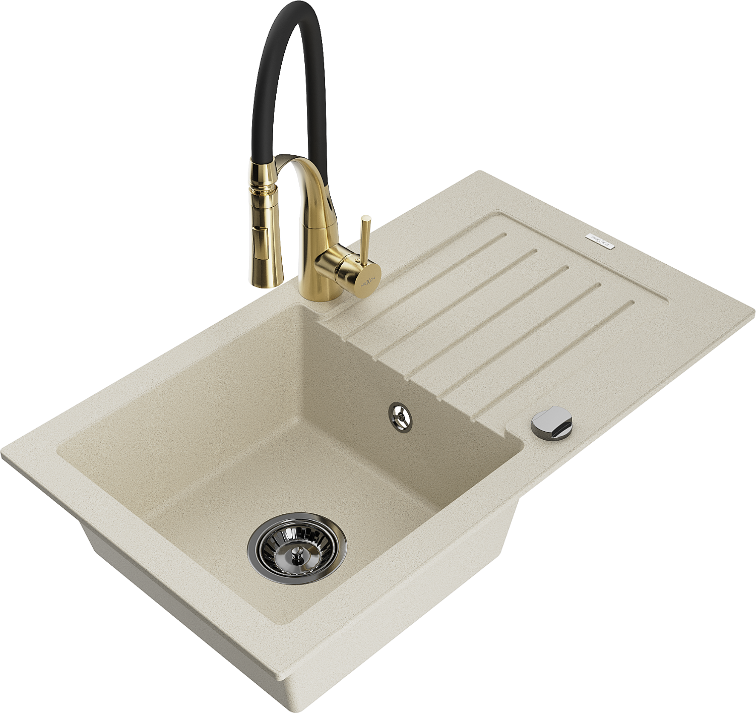 Mexen Pablo egymedencés gránit mosogató csepegtetővel és Aster konyhai csapteleppel, bézs - 6510-69-73450-57-B