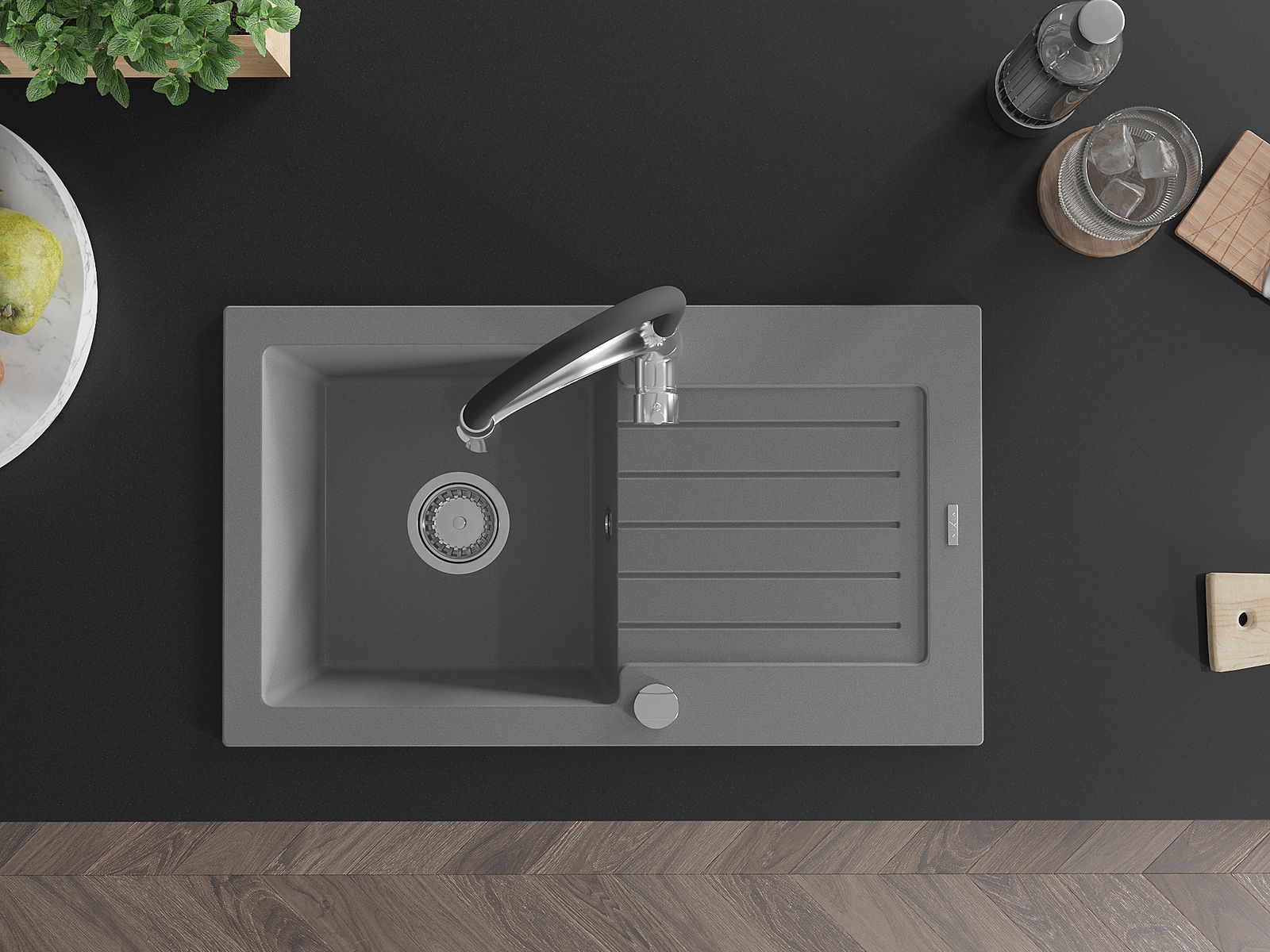A mosogató magas minőségű gránitból készült. Elegáns, de mindenekelőtt praktikus kiegészítője minden konyhának, függetlenül annak stílusától. A gránit magas minősége és tartóssága hosszú távú használatot biztosít.