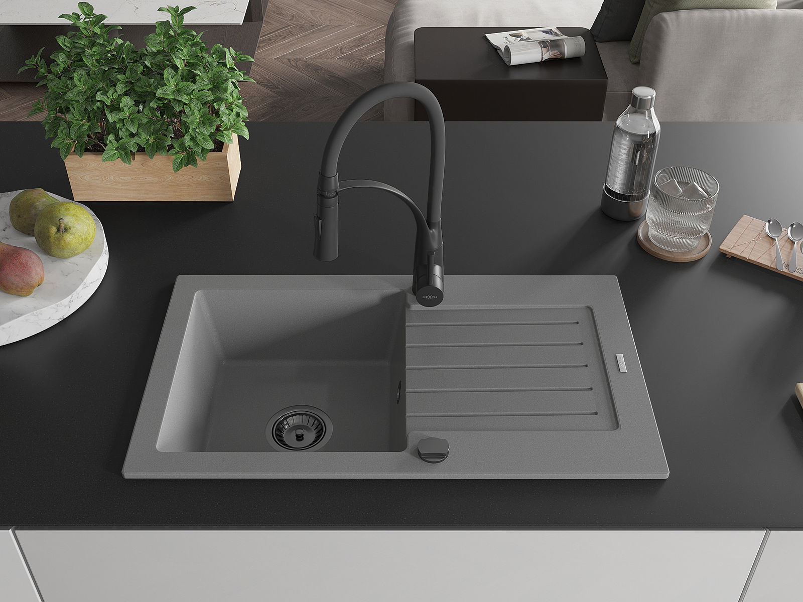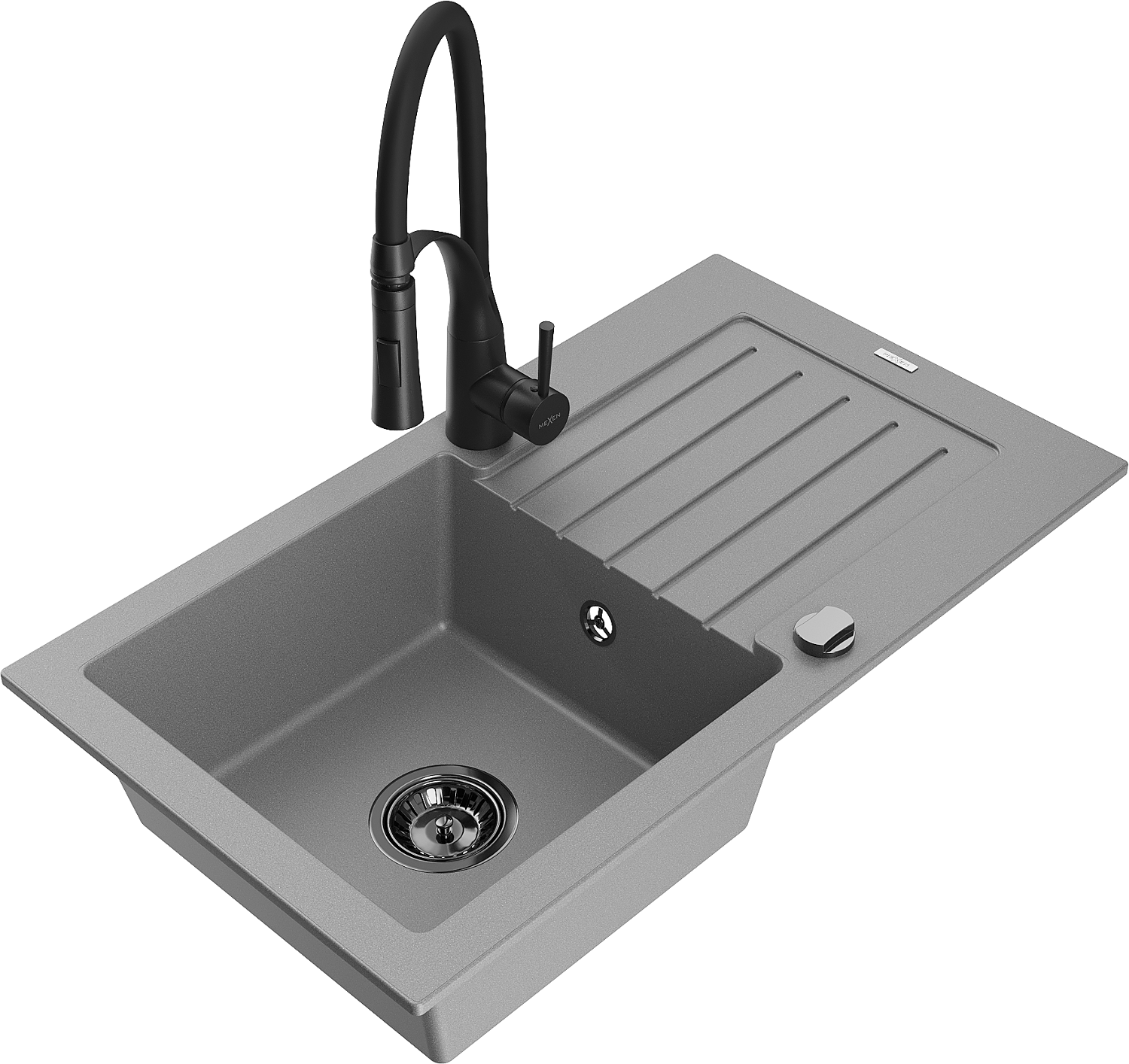 Mexen Pablo egykamrás gránit mosogató csepegtetővel és Aster konyhai csapteleppel, szürke - 6510-71-73450-70-B