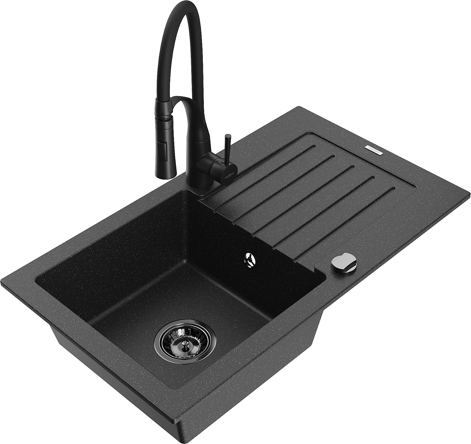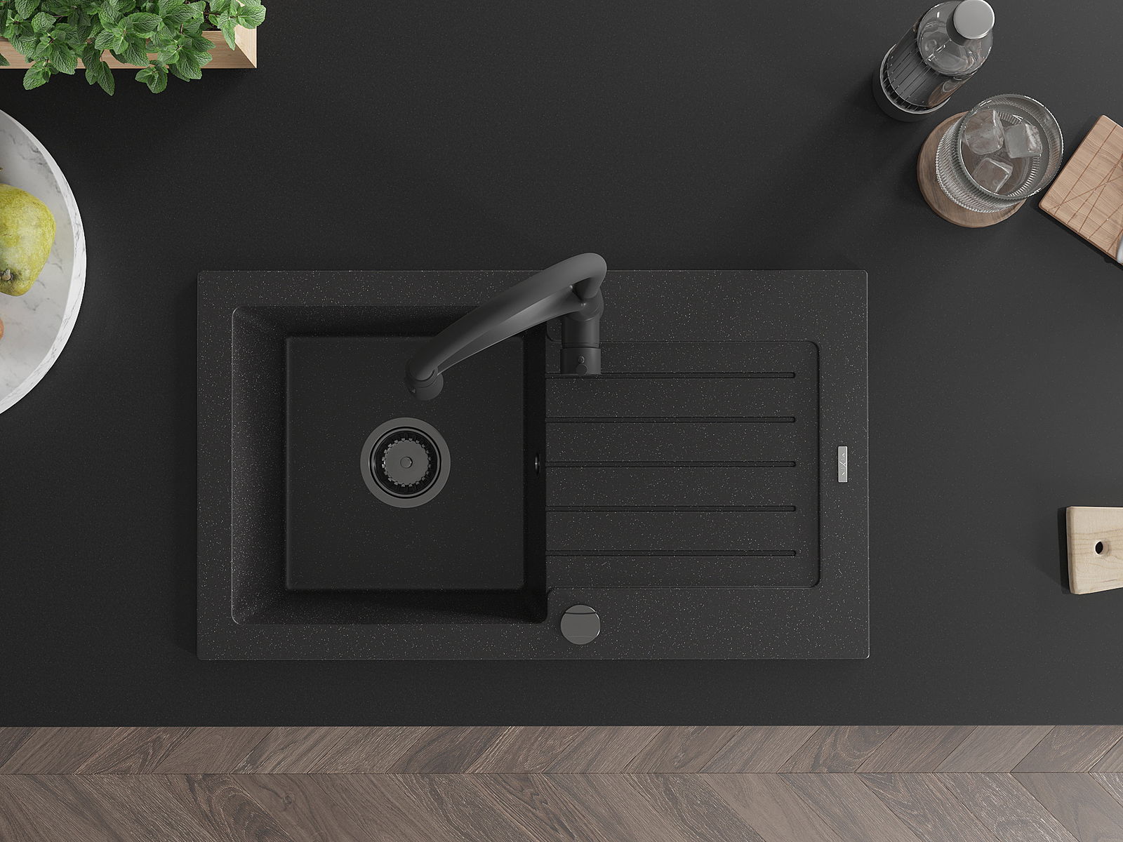 Mexen Pablo egykamrás gránit mosogató csepegtetővel és Aster konyhai csappal, fekete/ezüst metál - 6510-73-73450-70-B