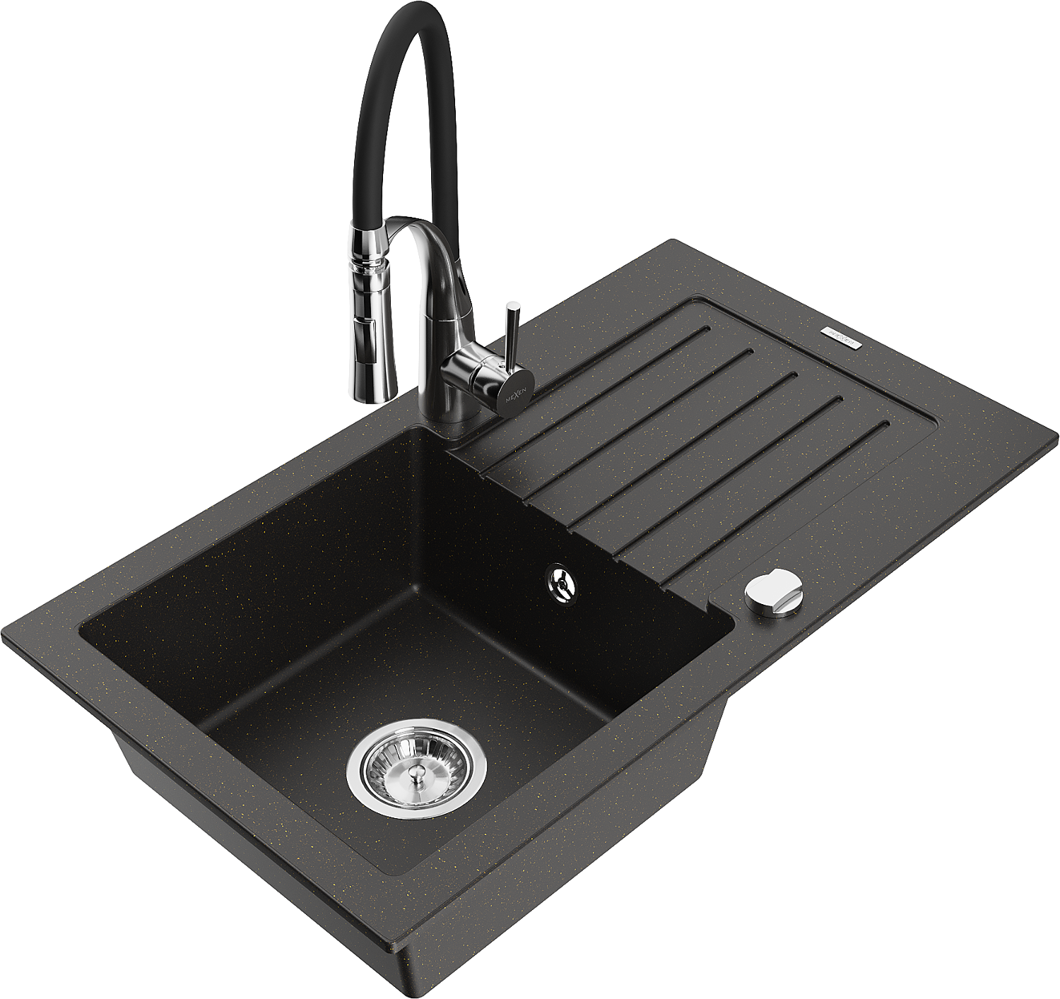 Mexen Pablo egymedencés gránit mosogató lefolyóval és Aster konyhai csapteleppel, fekete/arany metalik - 6510-75-73450-07