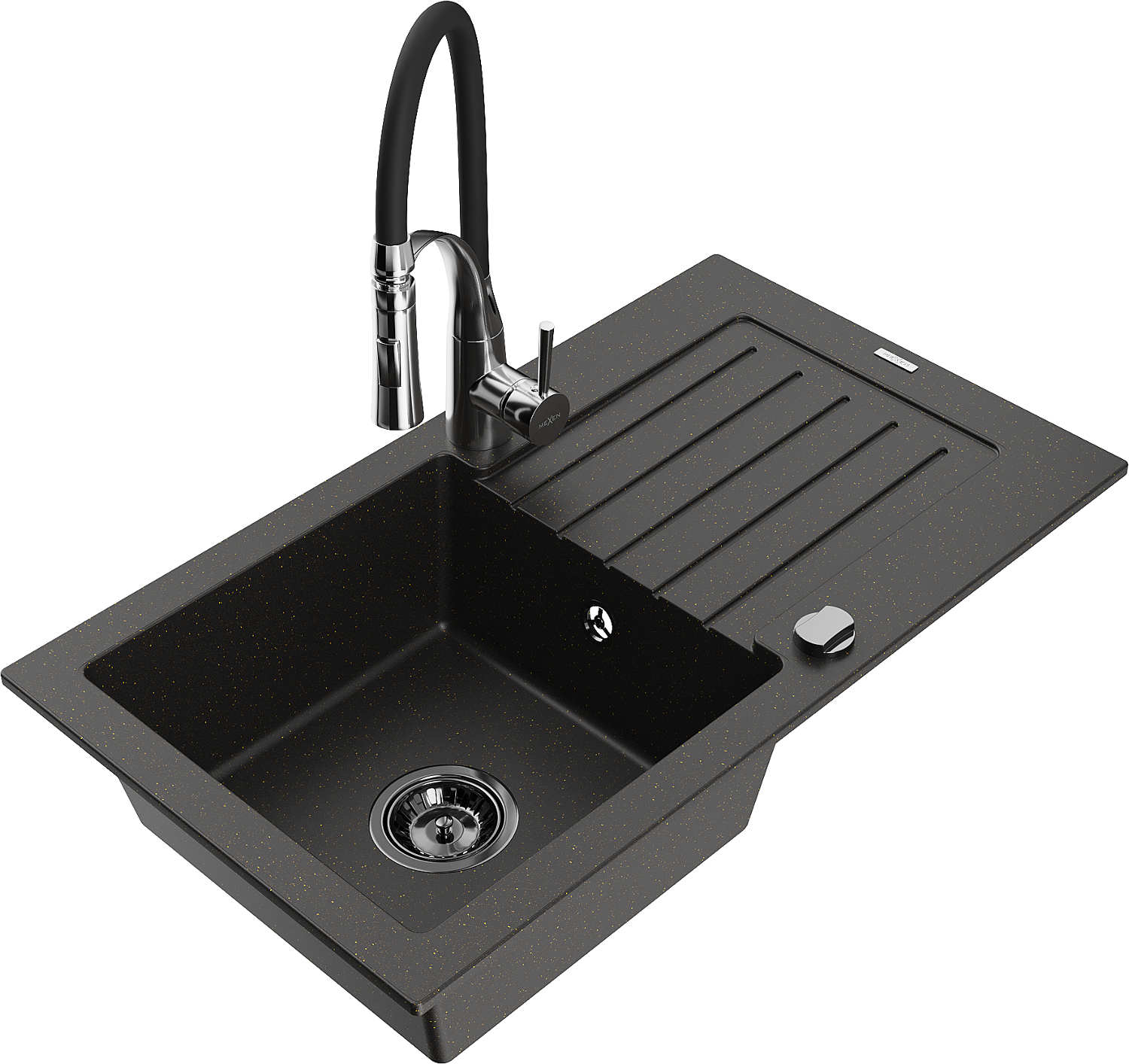 Mexen Pablo egymedencés gránit mosogató lefolyóval és Aster konyhai csappal, fekete/arany metál - 6510-75-73450-07-B