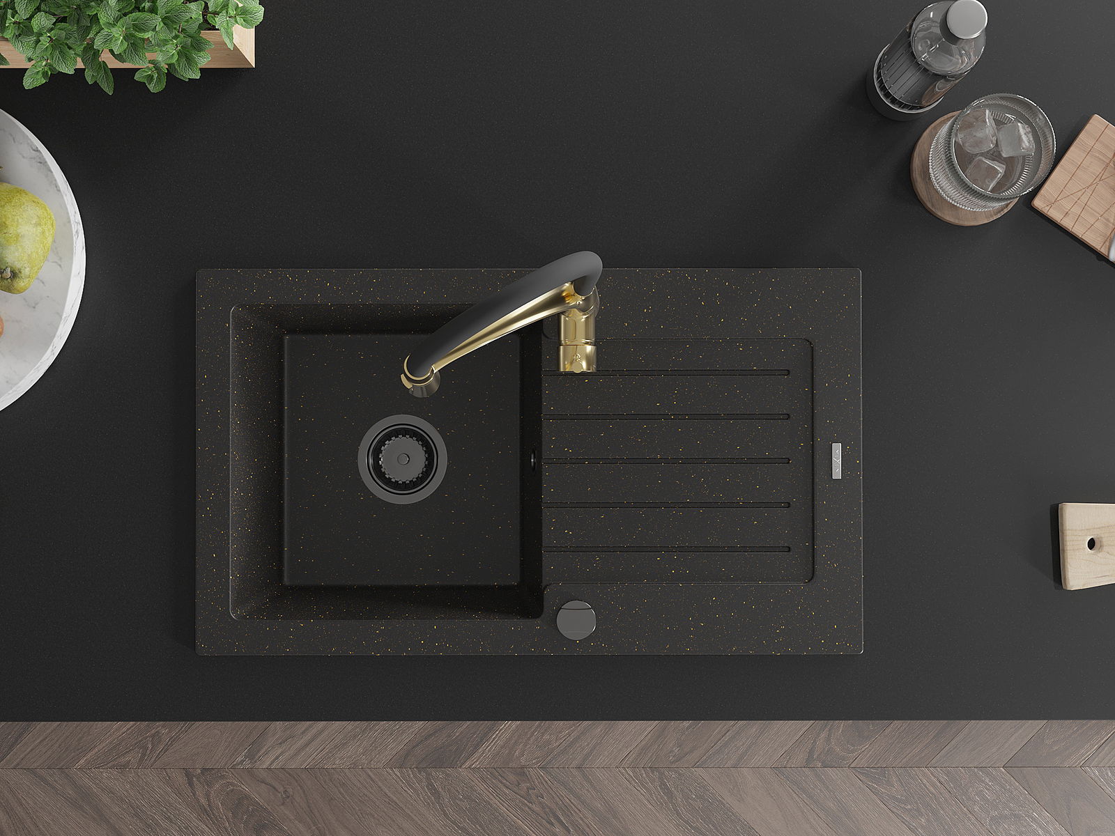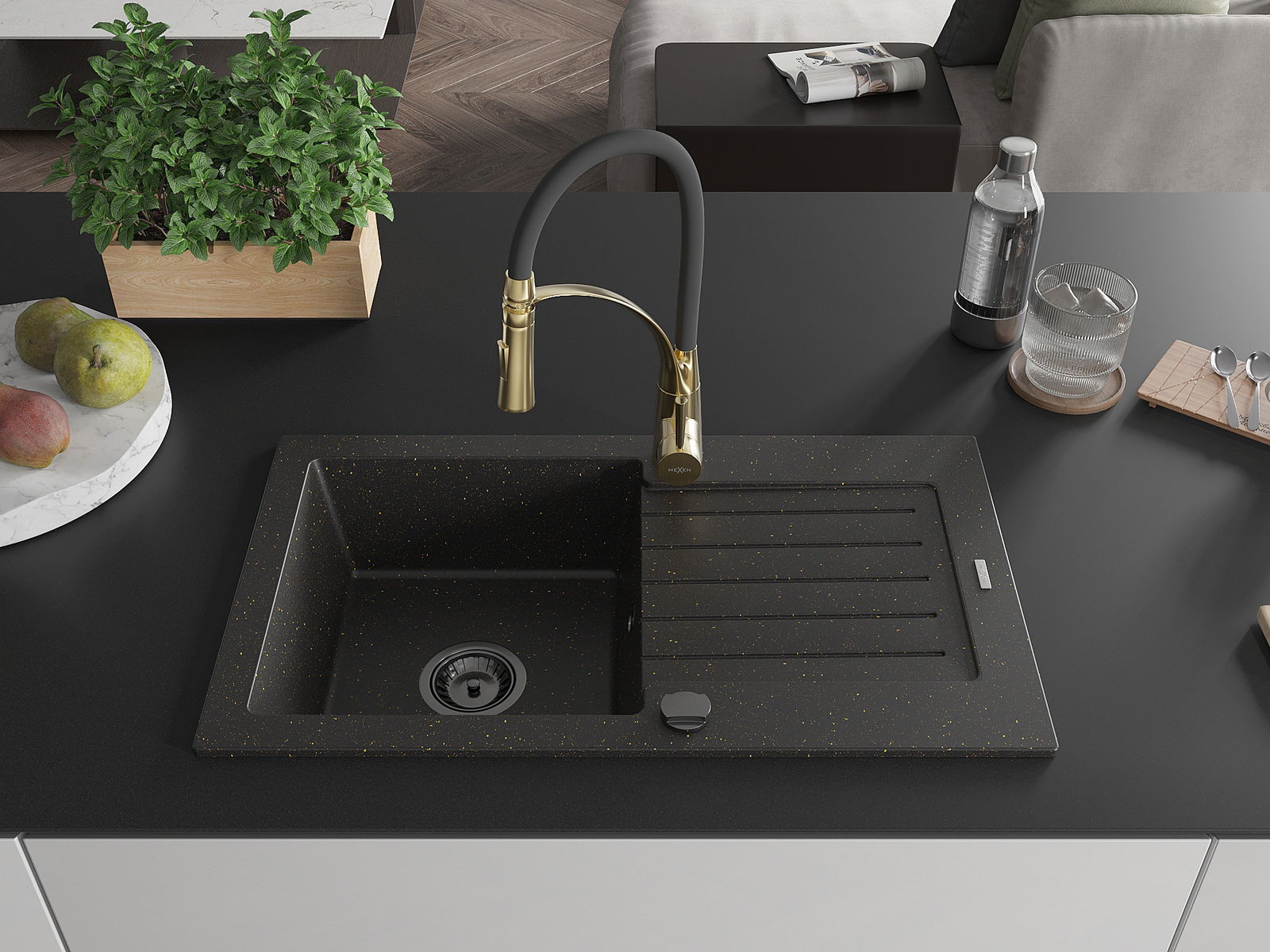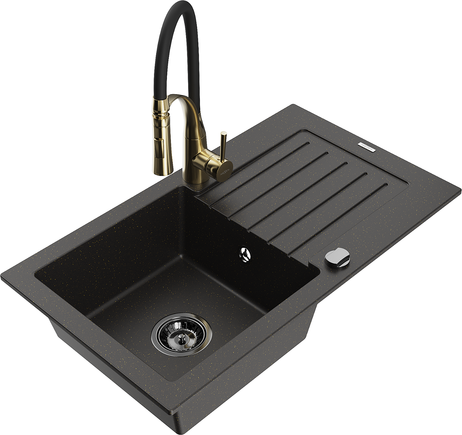 Mexen Pablo gránit mosogató 1-medencés csepegtetővel és Aster konyhai csapteleppel, fekete/arany metál - 6510-75-73450-57-B