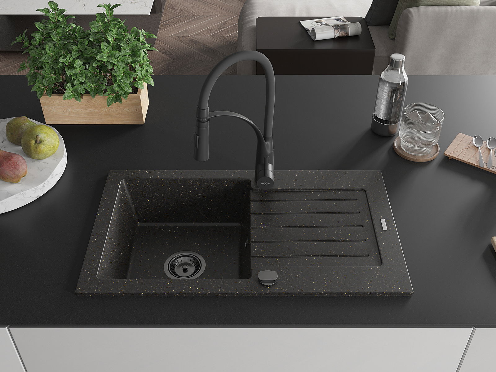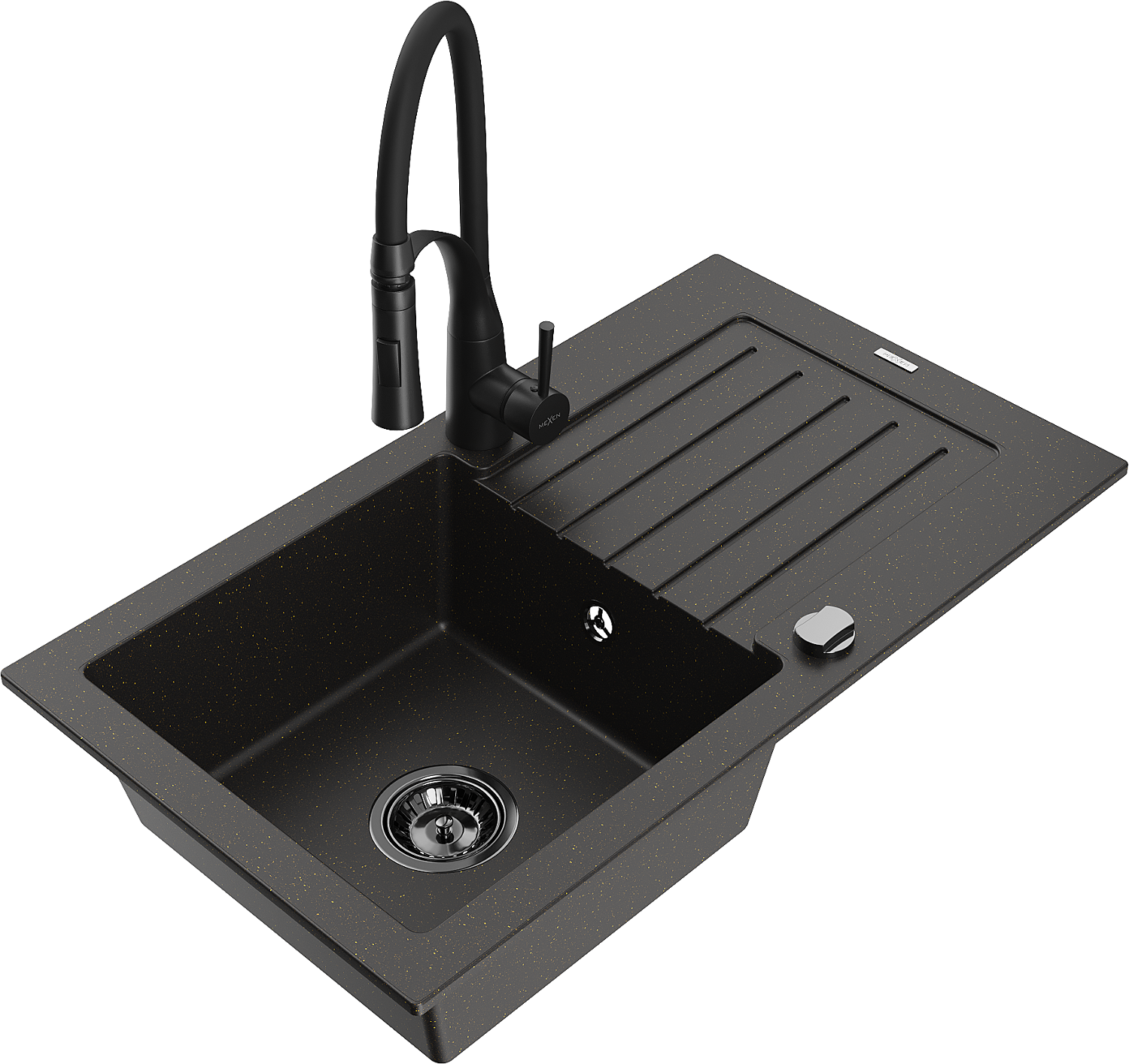 Mexen Pablo egymedencés mosogató csepptálcával és Aster konyhai csapteleppel, fekete/arany metál - 6510-75-73450-70-B