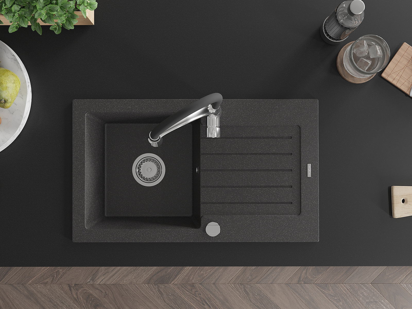 A mosogató magas minőségű gránitból készült. Elegáns, de mindenekelőtt praktikus kiegészítője minden konyhának, függetlenül annak stílusától. A gránit magas minősége és tartóssága hosszú távú használatot biztosít.