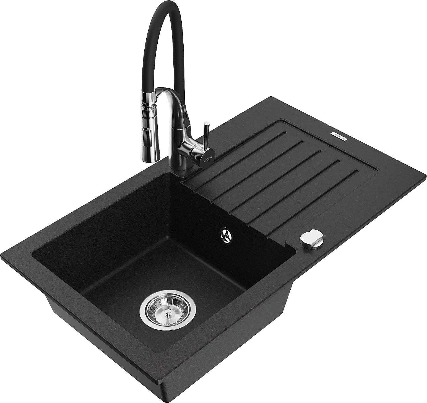 Mexen Pablo egymedencés gránit mosogató csepegtetővel és Aster konyhai csapteleppel, fekete - 6510-77-73450-07