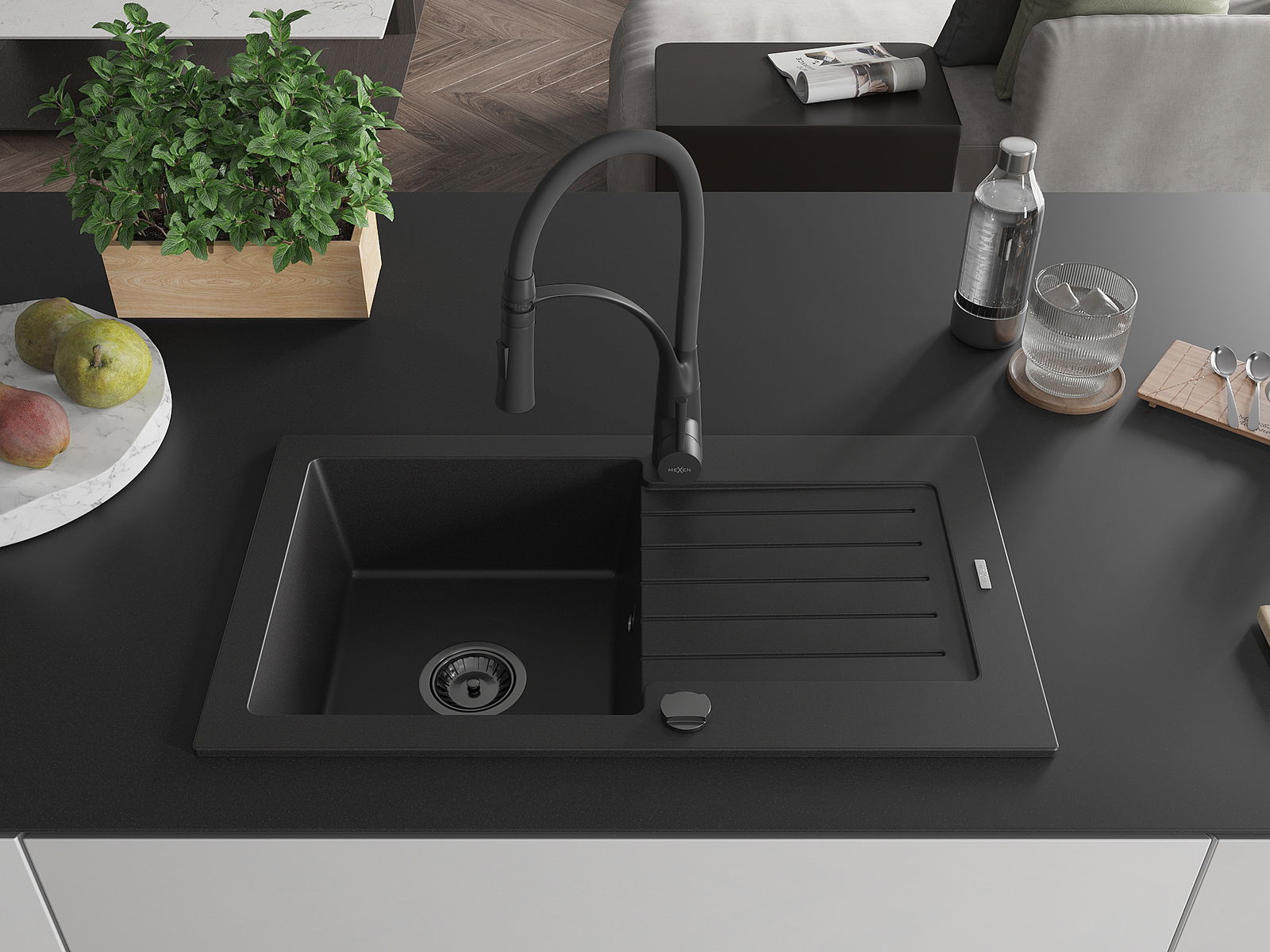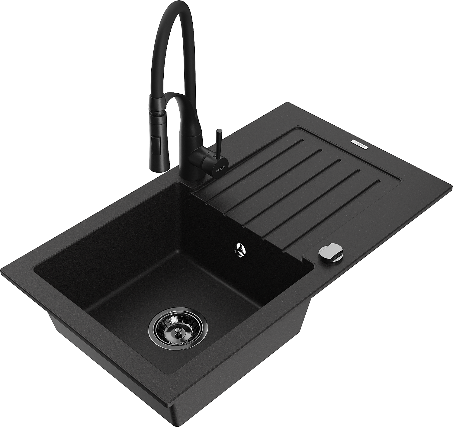 Mexen Pablo 1 rekeszes gránit mosogató csepegtetővel és Aster konyhai csappal, fekete - 6510-77-73450-70-B