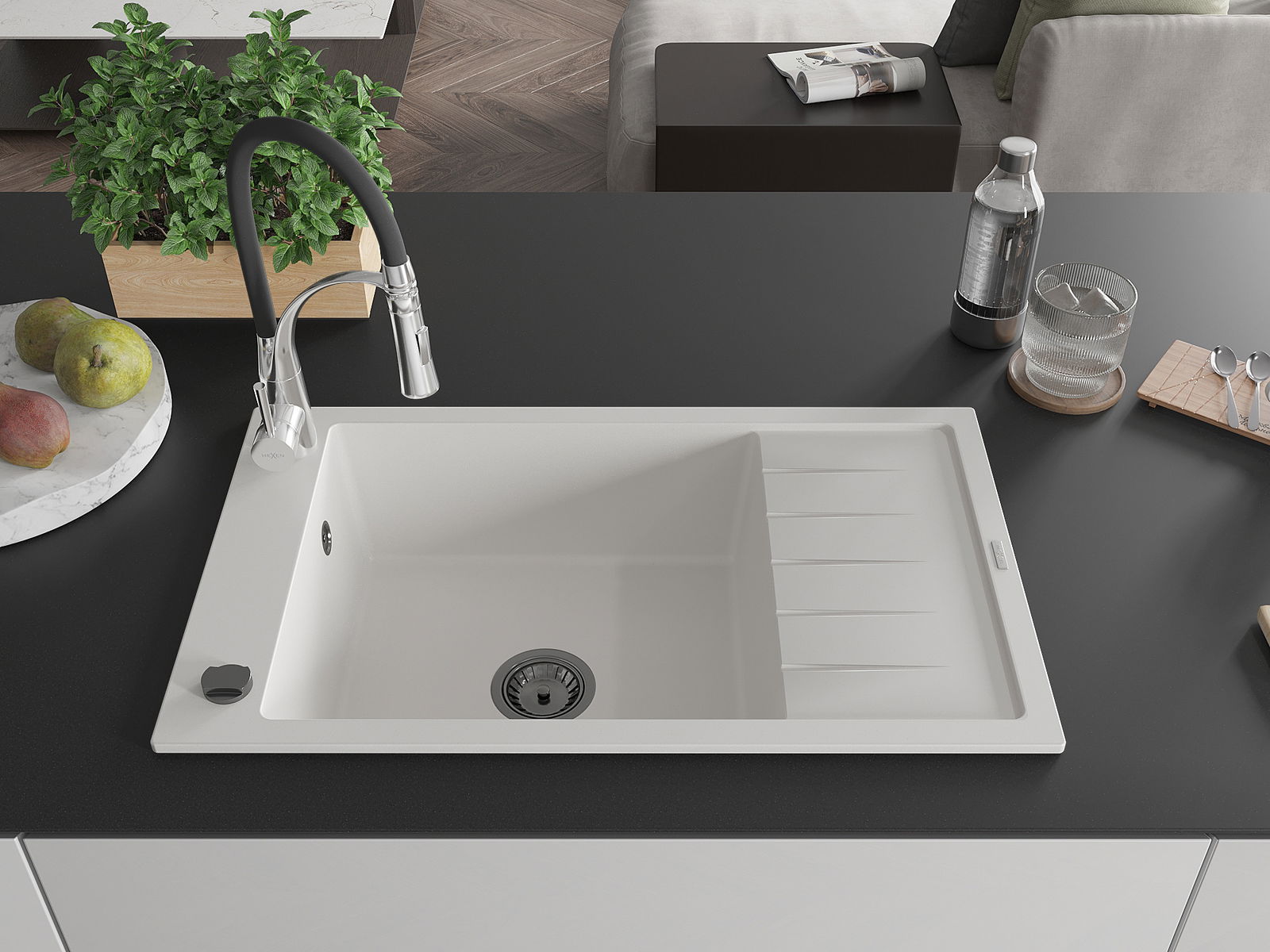 Mexen Elias egymedencés gránit mosogató csepegtetős felülettel és Aster konyhai csappal, fehér - 6511-20-73450-07-B