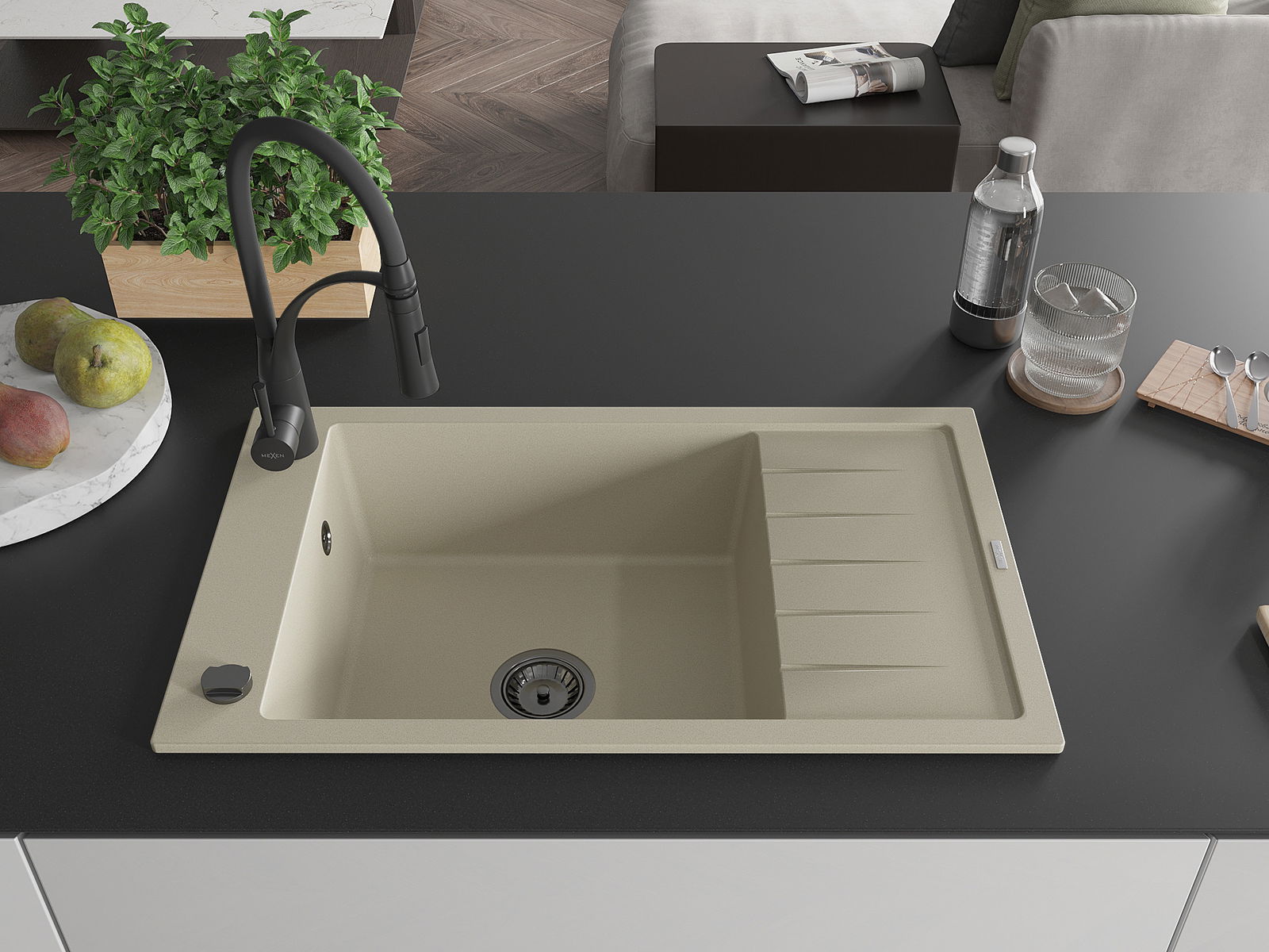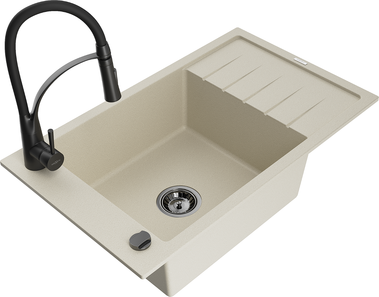 Mexen Elias gránit mosogató egykamrás csepegtetővel és Aster konyhai csappal, bézs - 6511-69-73450-70-B