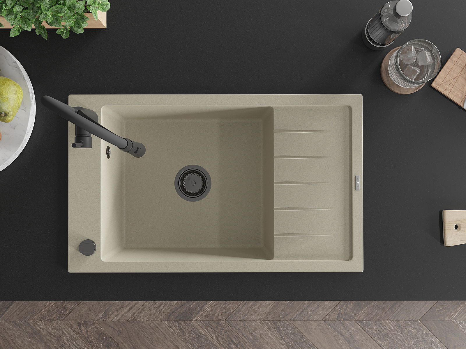A mosogató kiváló minőségű gránitból készül. Ez egy elegáns és mindenekelőtt minden konyhához praktikus kiegészítés, stílusától függetlenül. A kiváló minőségű és a gránit tartósság biztosítja a sok éves használatát.