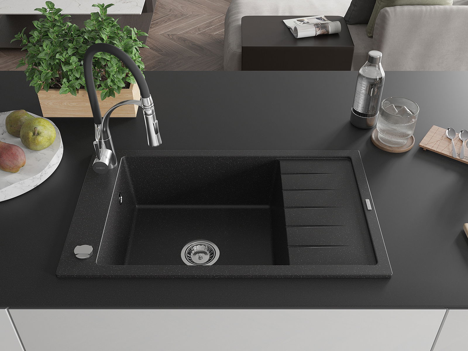 Mexen Elias 1-medencés gránit mosogató csöpögtetővel és Aster konyhai csapteleppel, fekete/ezüst metál - 6511-73-73450-07