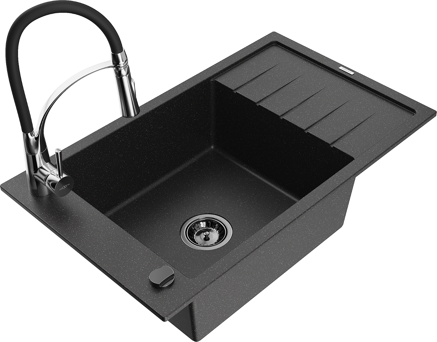Mexen Elias gránit mosogató 1-medencés csepegtetővel és Aster konyhai csapteleppel, fekete/ezüst metál - 6511-73-73450-07-B