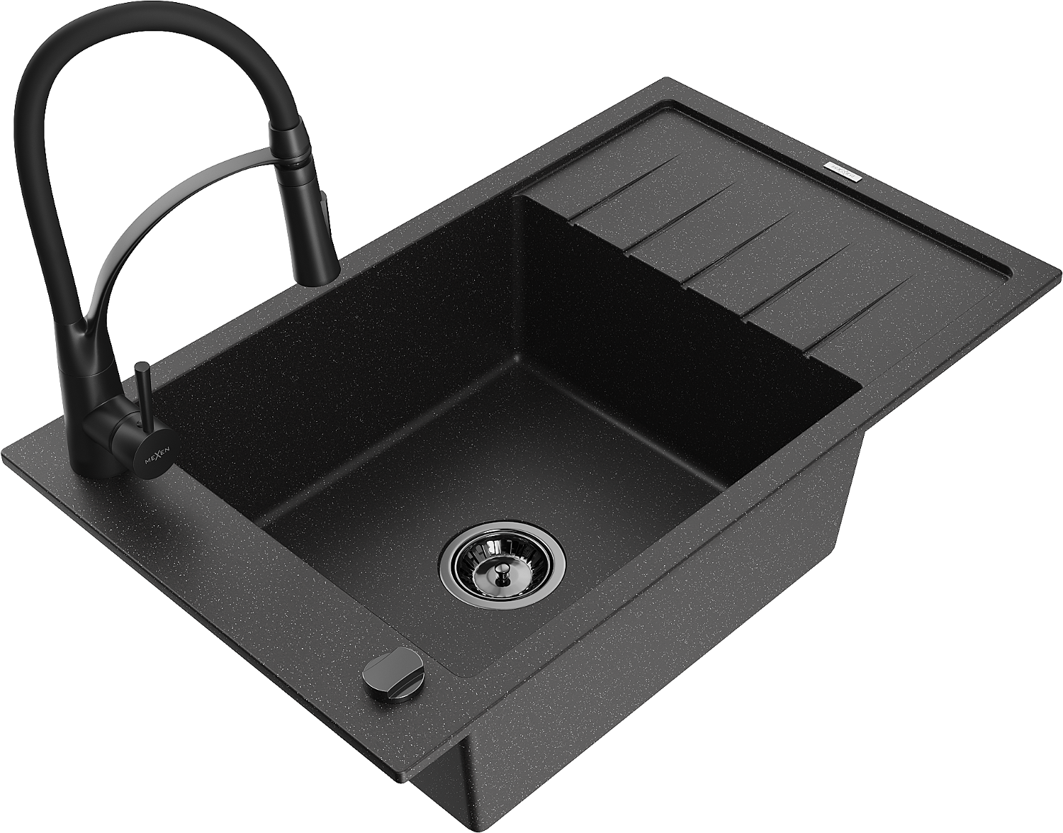 Mexen Elias 1-rekeszes gránit mosogató csepegtetővel és Aster konyhai csapteleppel, fekete/ezüst metál - 6511-73-73450-70-B