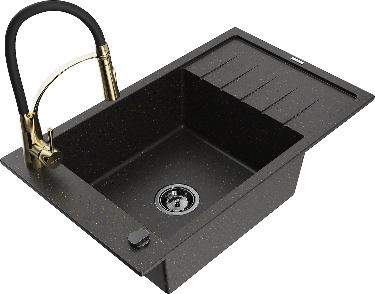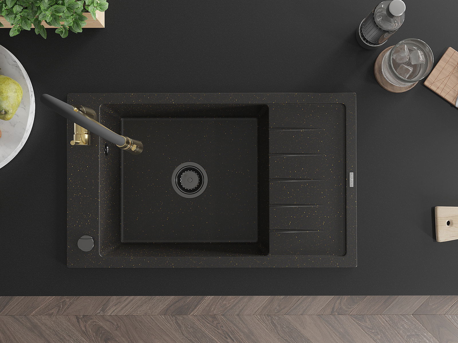 Mexen Elias 1-medencés gránit mosogató lefolyóval és Aster konyhai csapteleppel, fekete/arany metál - 6511-75-73450-57-B