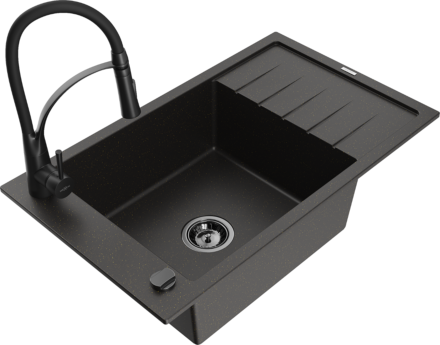 Mexen Elias egymedencés gránit mosogató csepptálcával és Aster konyhai csapteleppel, fekete/arany metál - 6511-75-73450-70-B