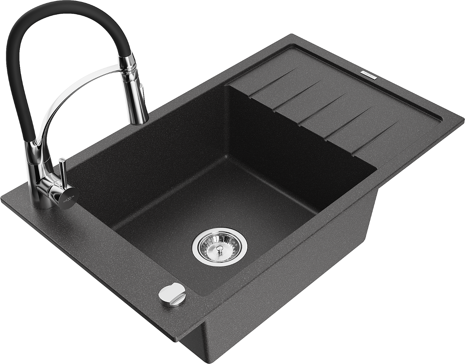 Mexen Elias 1-medencés gránit mosogató csepegtetővel és Aster konyhai csapteleppel, fekete pöttyös - 6511-76-73450-07