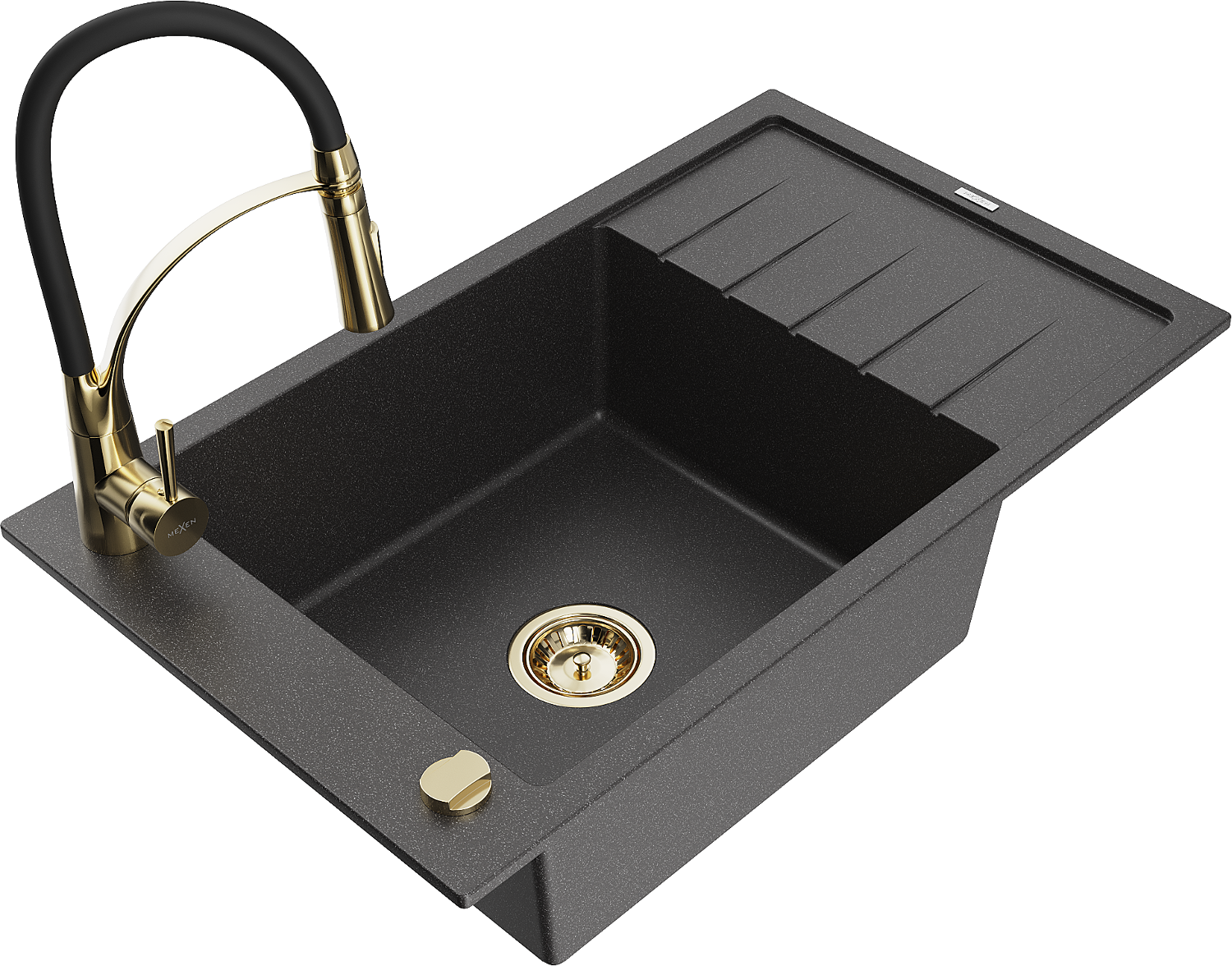 Mexen Elias 1-kamrás gránit mosogató lefolyóval és Aster konyhai csapteleppel, fekete pöttyös - 6511-76-73450-57-G