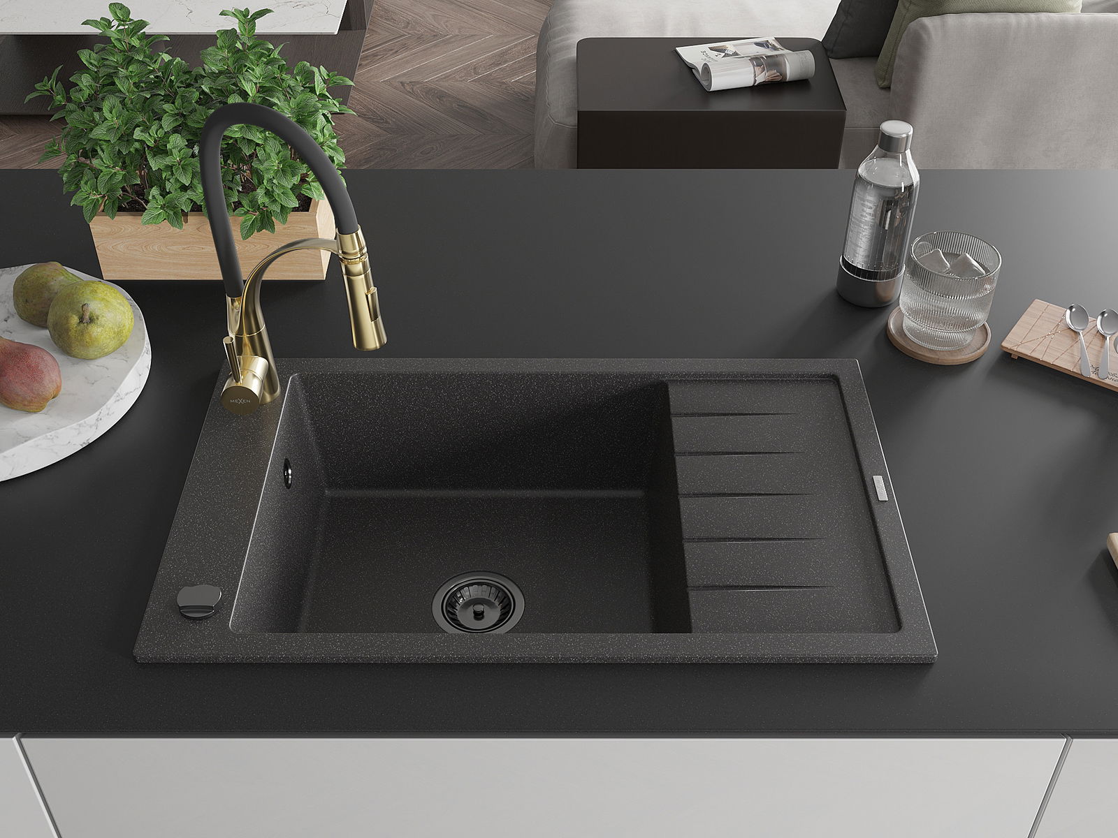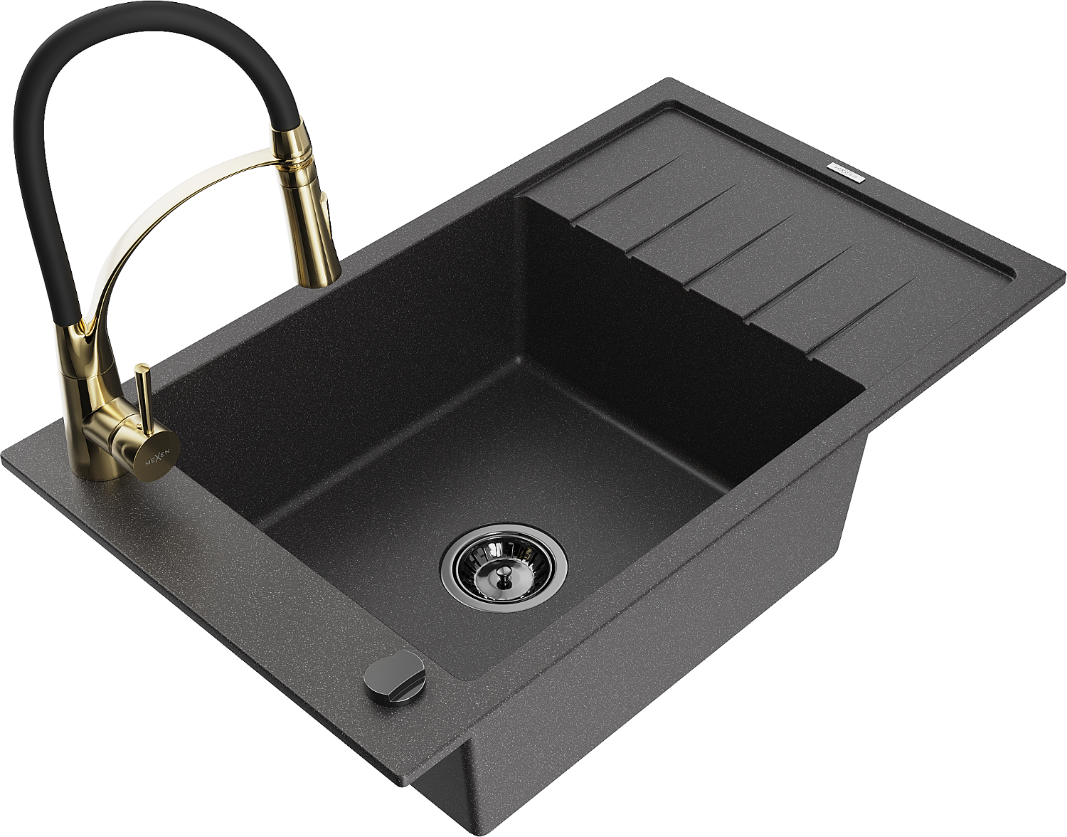 Mexen Elias 1-medencés gránit mosogató csepegtetővel és Aster konyhai csapteleppel, fekete pöttyös - 6511-76-73450-57-B