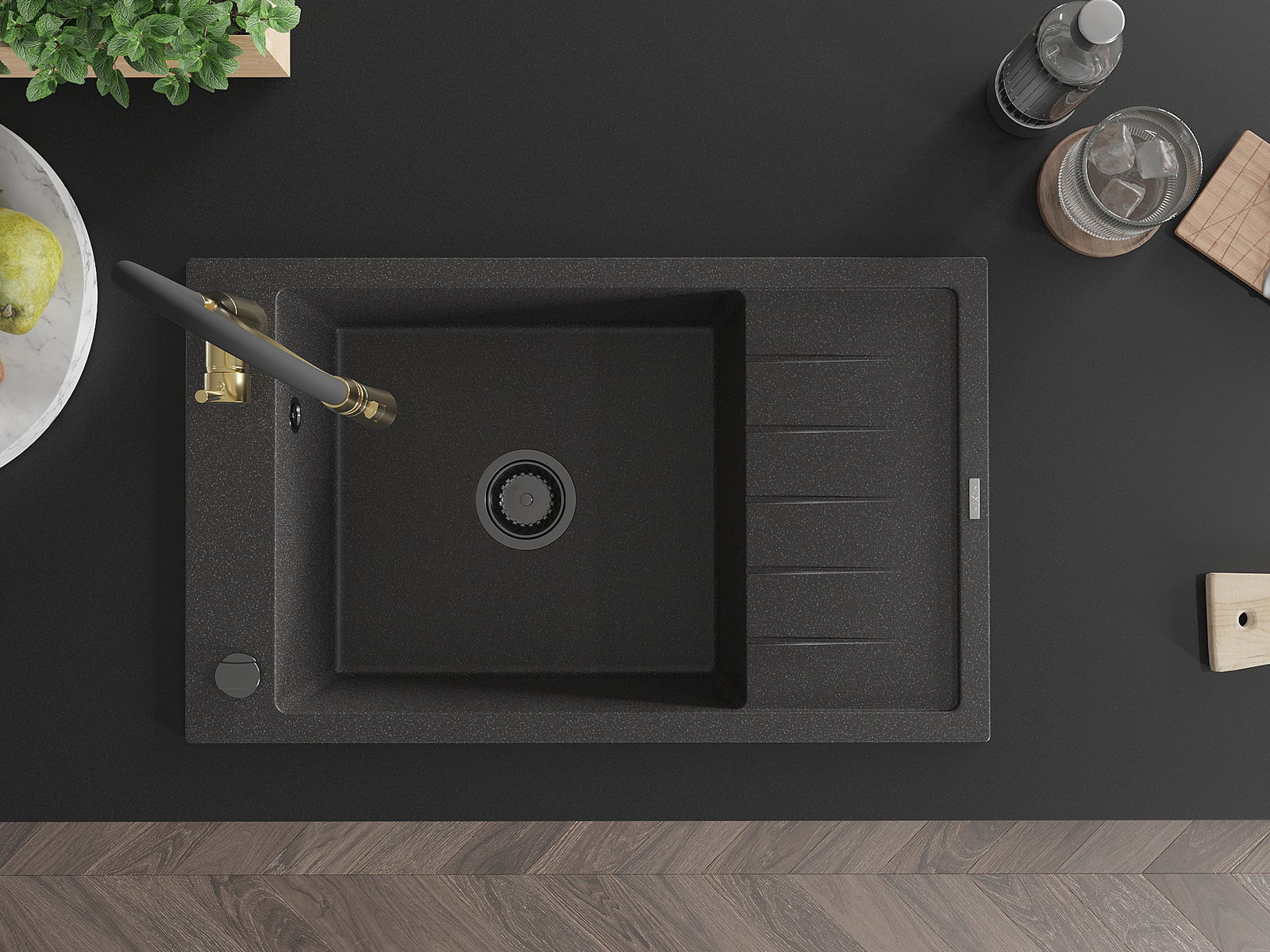 A mosogató kiváló minőségű gránitból készül. Ez egy elegáns és mindenekelőtt minden konyhához praktikus kiegészítés, stílusától függetlenül. A kiváló minőségű és a gránit tartósság biztosítja a sok éves használatát.