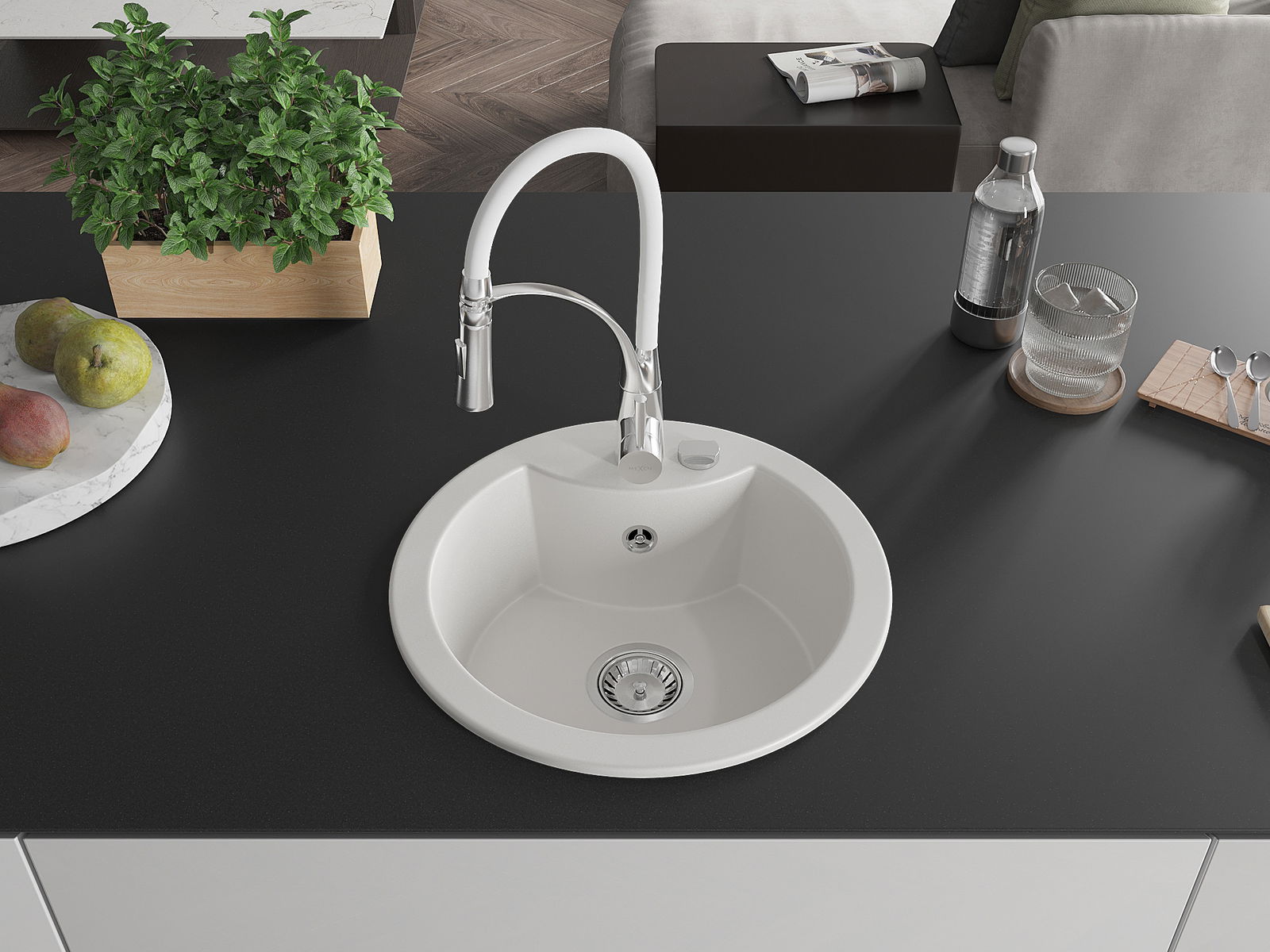 A mosogató kiváló minőségű gránitból készül. Ez egy elegáns és mindenekelőtt minden konyhához praktikus kiegészítés, stílusától függetlenül. A kiváló minőségű és a gránit tartósság biztosítja a sok éves használatát.
