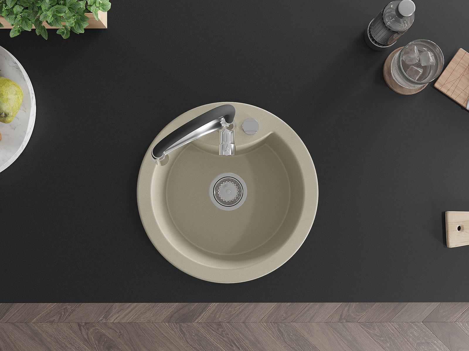 A mosogató kiváló minőségű gránitból készül. Ez egy elegáns és mindenekelőtt minden konyhához praktikus kiegészítés, stílusától függetlenül. A kiváló minőségű és a gránit tartósság biztosítja a sok éves használatát.