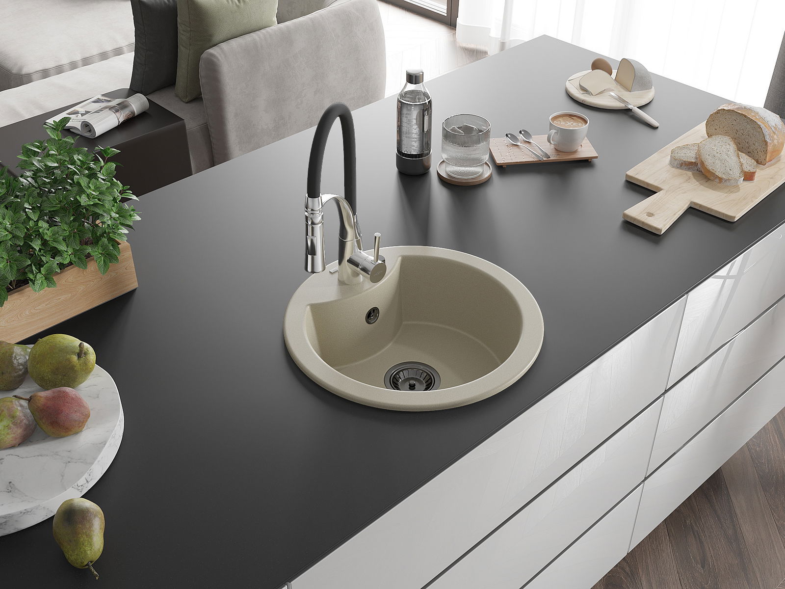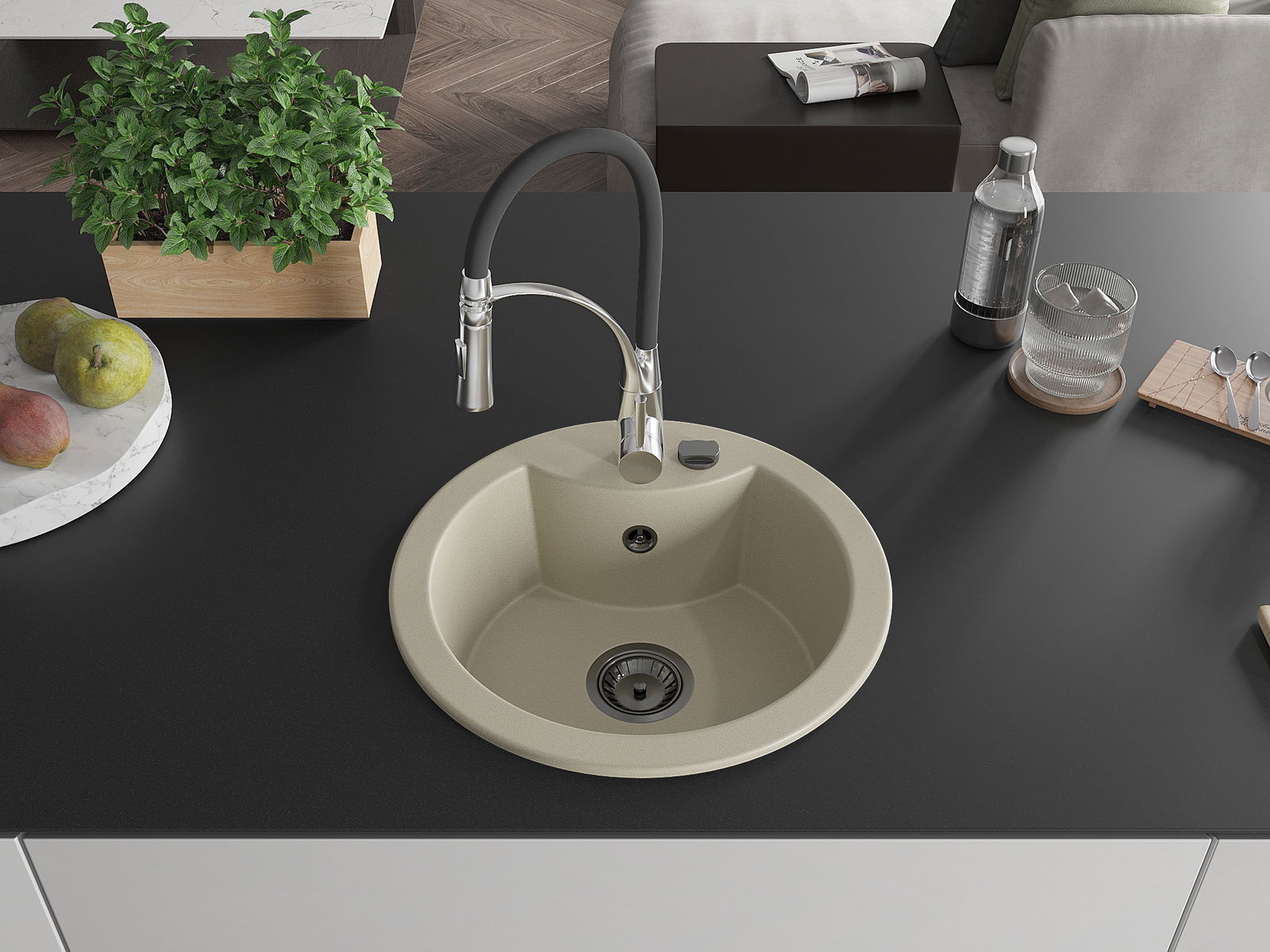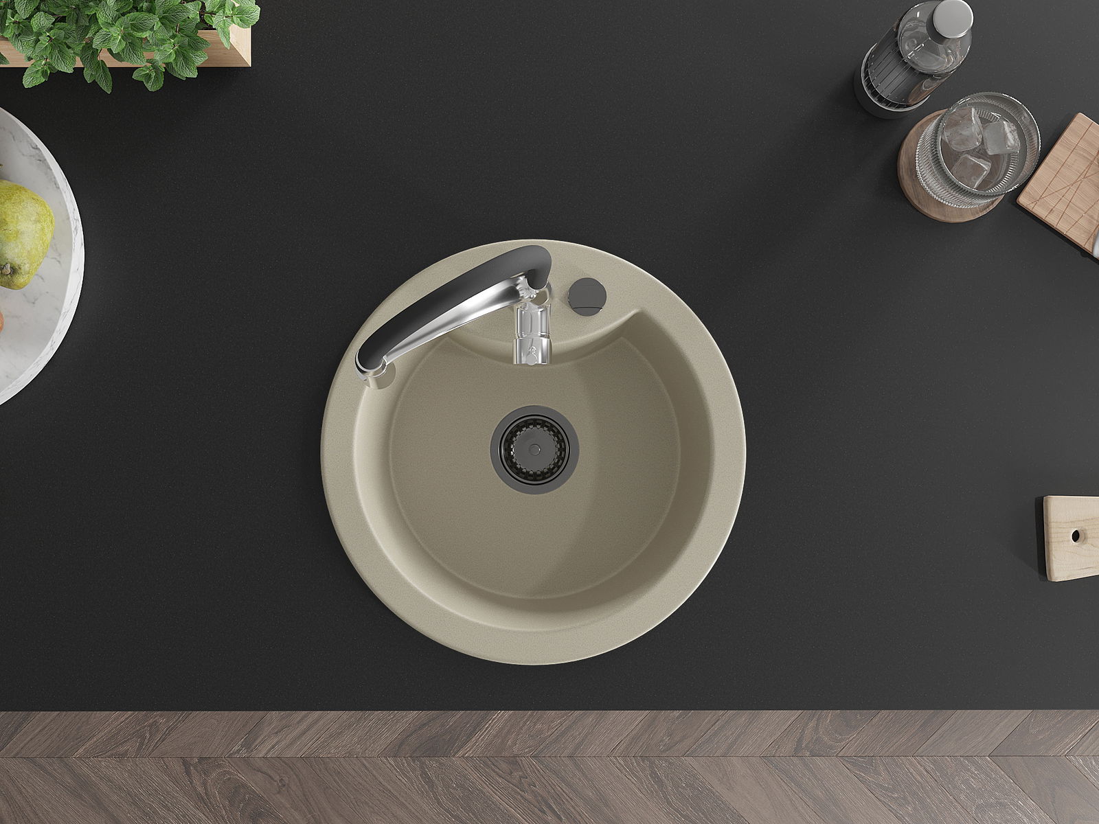 A mosogató kiváló minőségű gránitból készül. Ez egy elegáns és mindenekelőtt minden konyhához praktikus kiegészítés, stílusától függetlenül. A kiváló minőségű és a gránit tartósság biztosítja a sok éves használatát.