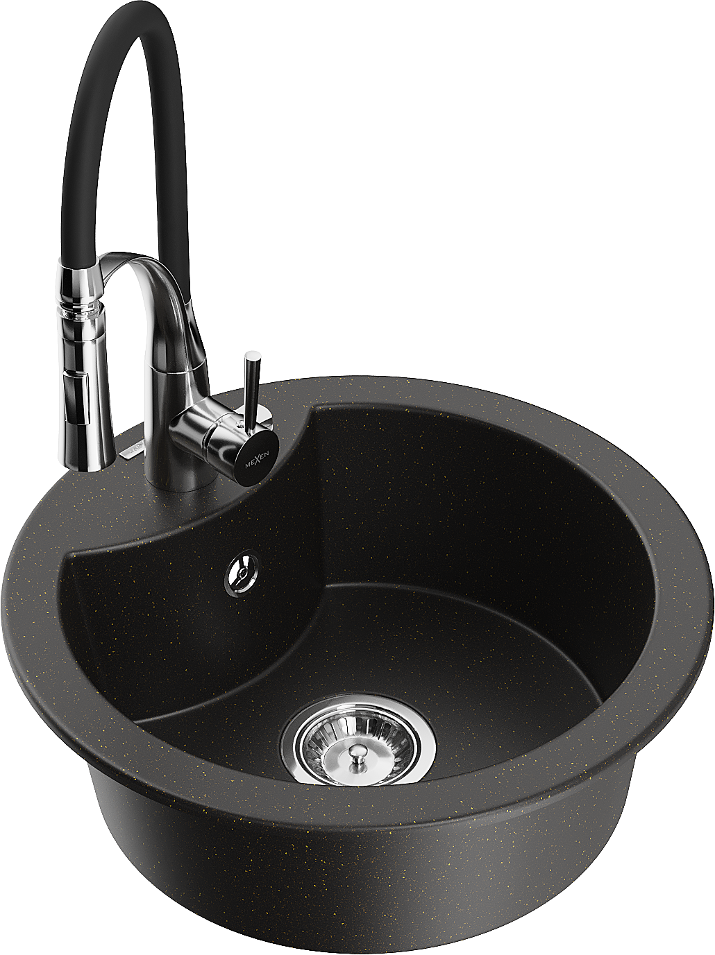 Mexen Diego egymedencés gránit mosogató Aster konyhai csappal, fekete/arany metál - 6512-75-73450-70