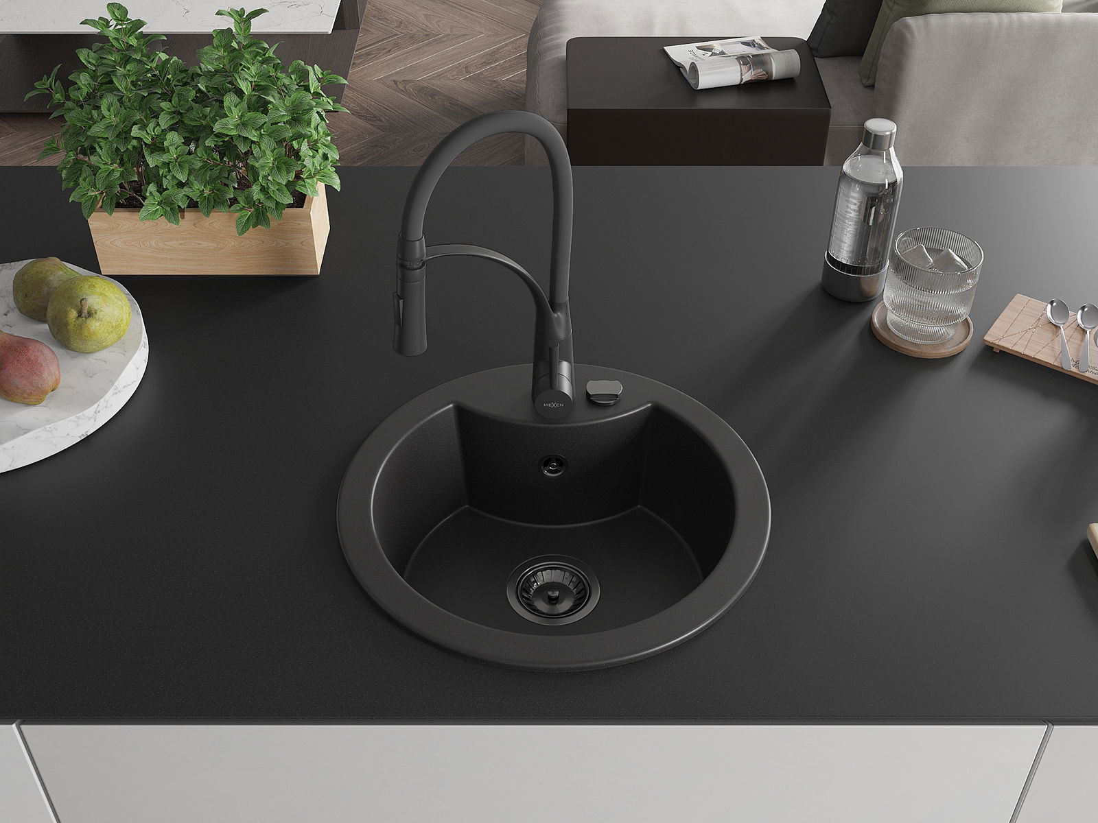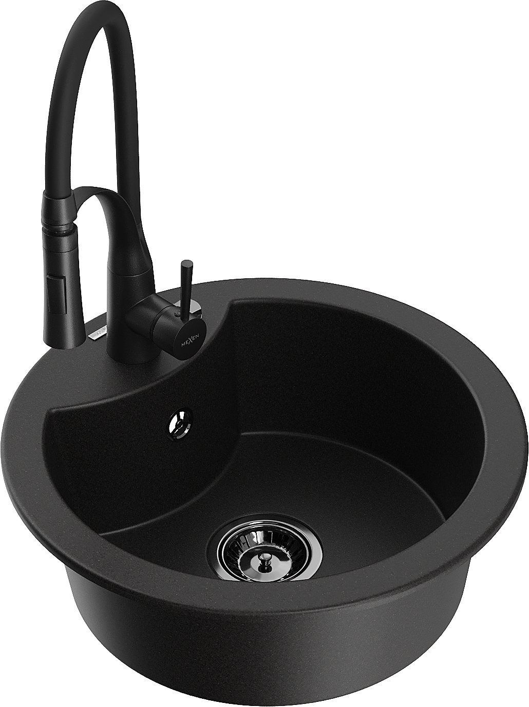 Mexen Diego gránit mosogatótál 1-medencés konyhai csappal Aster, fekete - 6512-77-73450-70-B