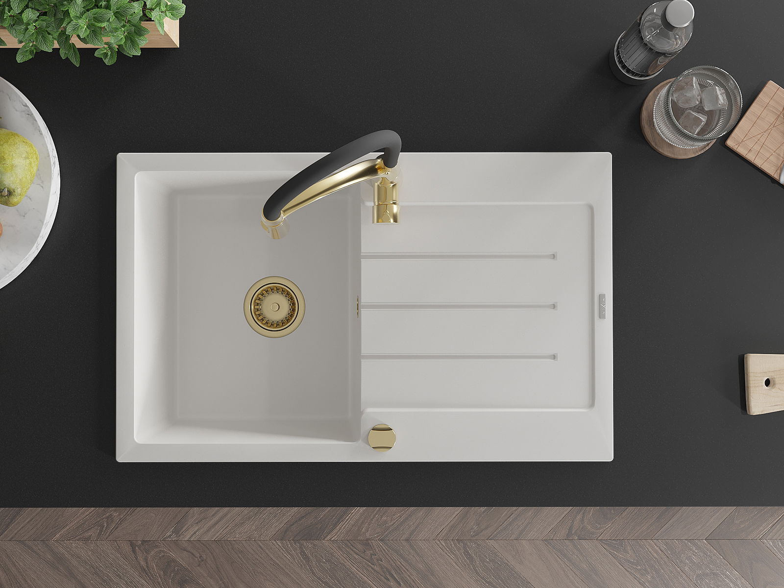 Mexen Bruno gránit egykamrás mosogató csepegtetővel és Aster konyhai csapteleppel, fehér - 6513-20-73450-57-G