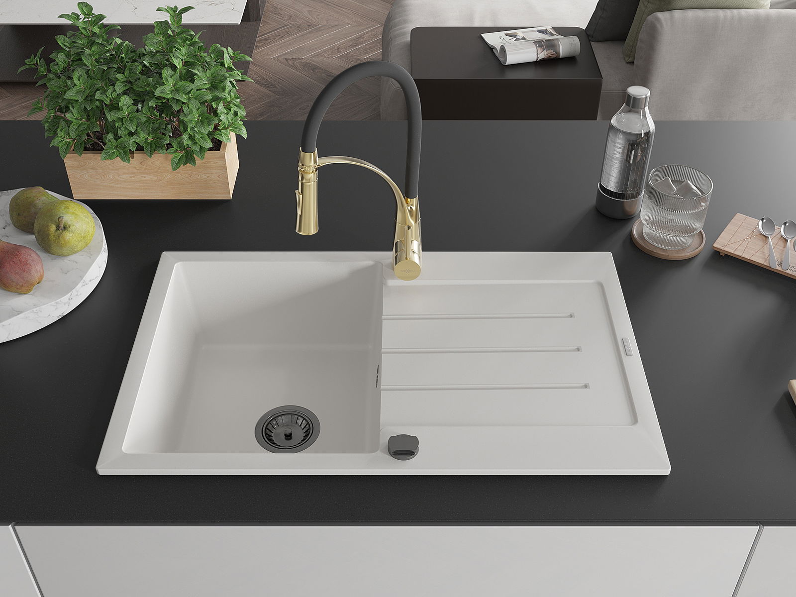 Mexen Bruno egymedencés gránit mosogató csepegtetővel és konyhai csapteleppel Aster, fehér - 6513-20-73450-57-B