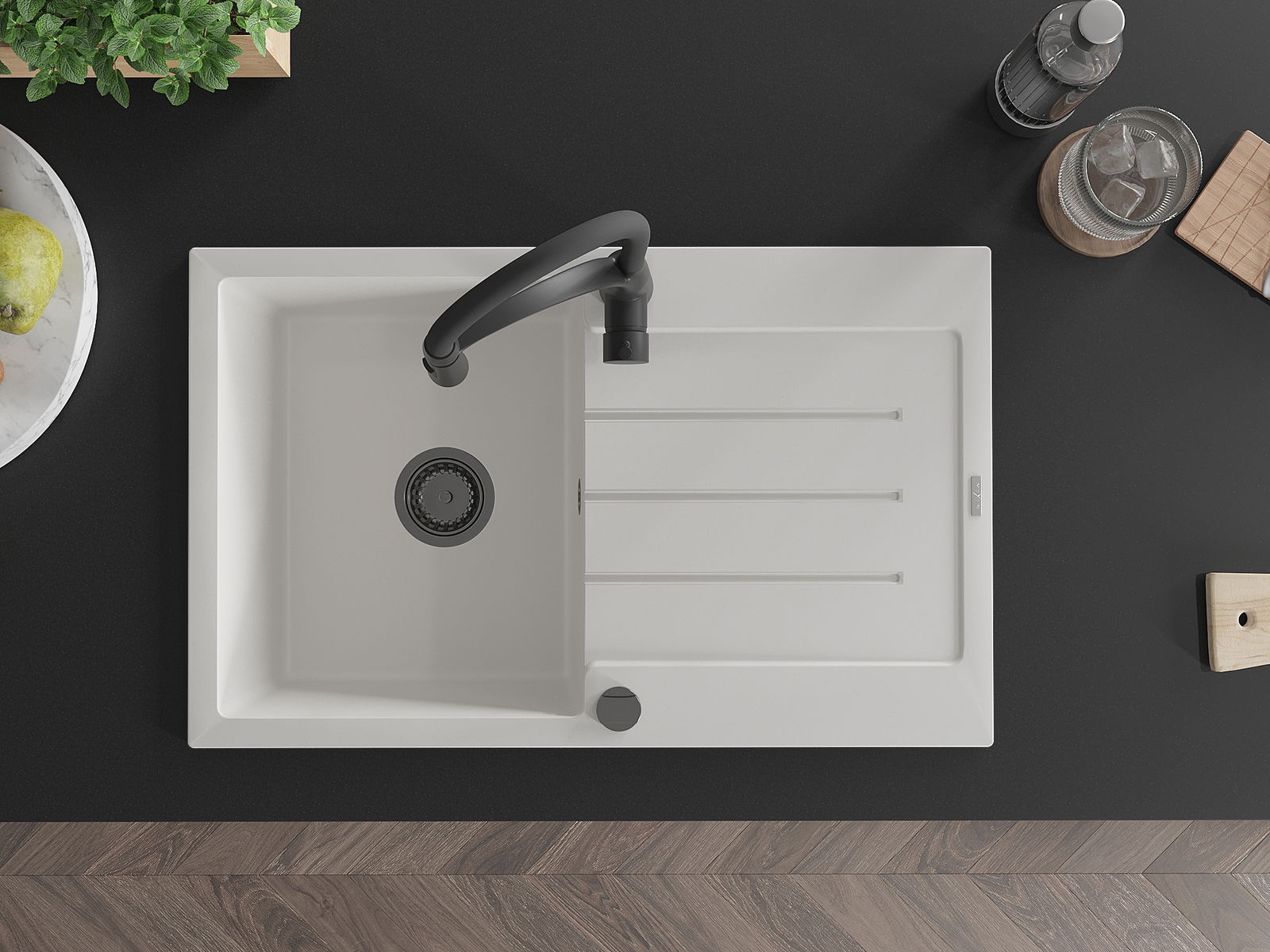 Mexen Bruno 1 medencés gránit mosogató csepegtetővel és Aster konyhai csapteleppel, fehér - 6513-20-73450-70-B