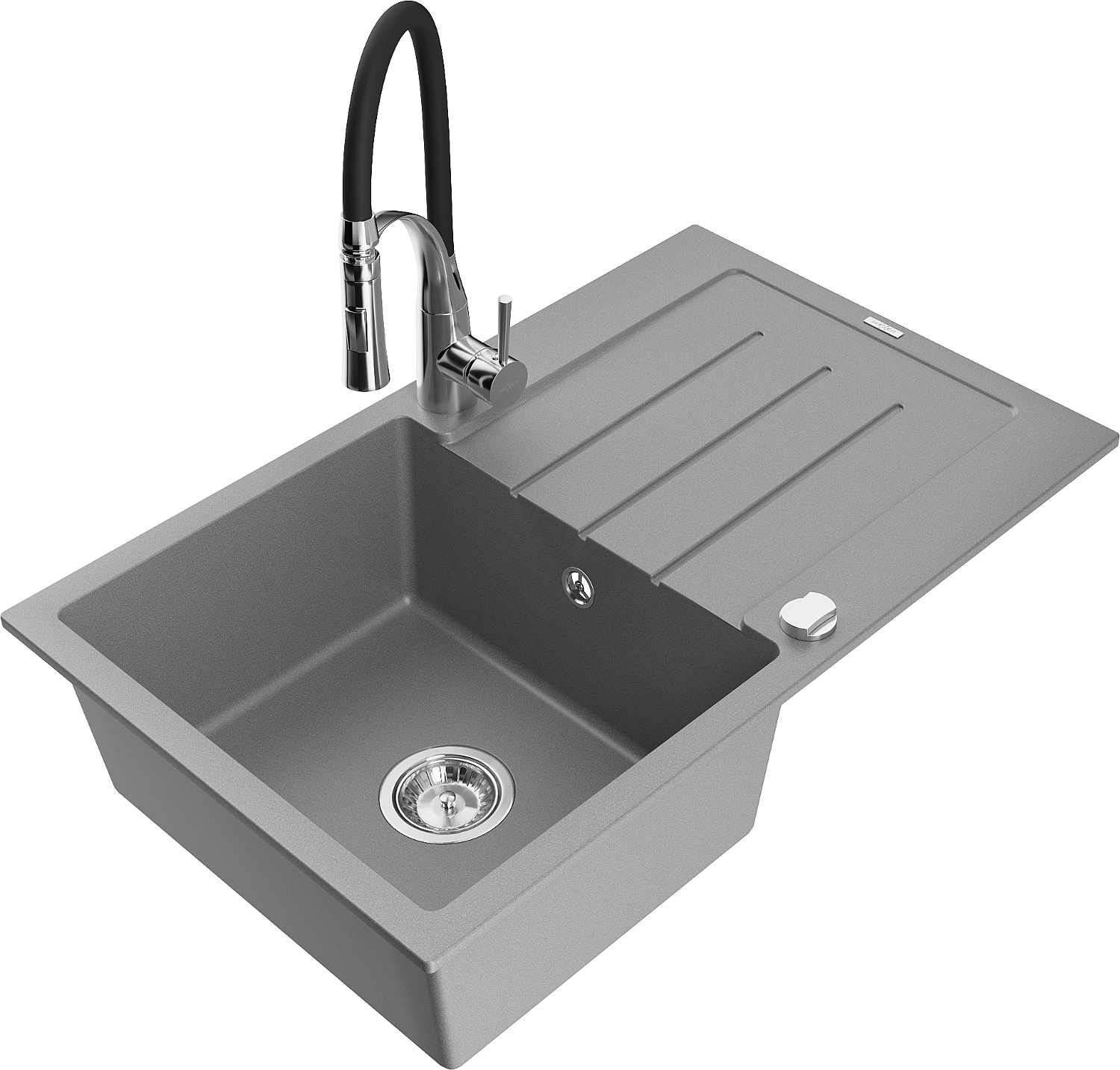 Mexen Bruno egykamrás gránit mosogató lefolyóval és Aster konyhai csappal, szürke - 6513-71-73450-07