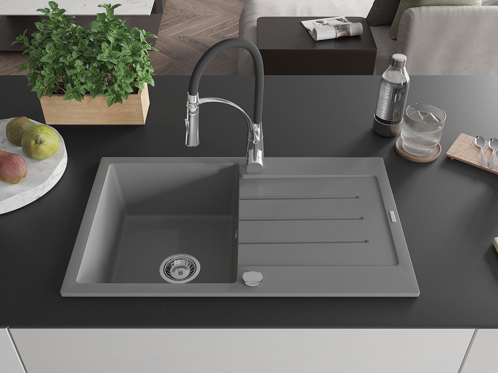 A mosogató kiváló minőségű gránitból készül. Ez egy elegáns és mindenekelőtt minden konyhához praktikus kiegészítés, stílusától függetlenül. A kiváló minőségű és a gránit tartósság biztosítja a sok éves használatát.