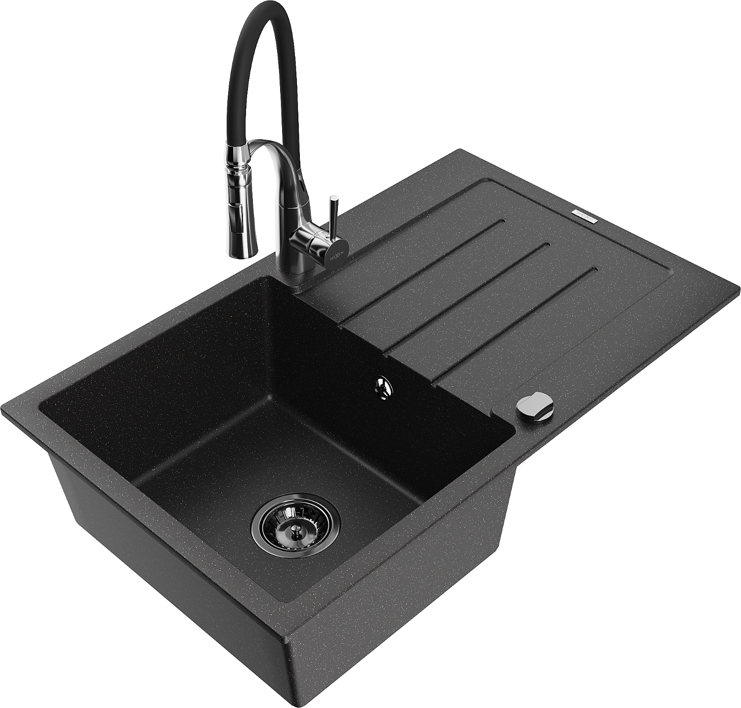 Mexen Bruno 1 rekeszes gránit mosogató csepegtetővel és Aster konyhai csapteleppel, fekete/ezüst metál - 6513-73-73450-07-B